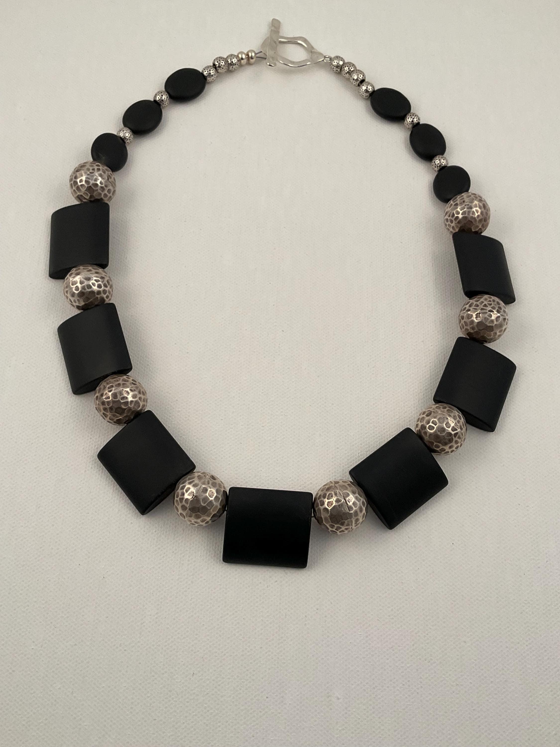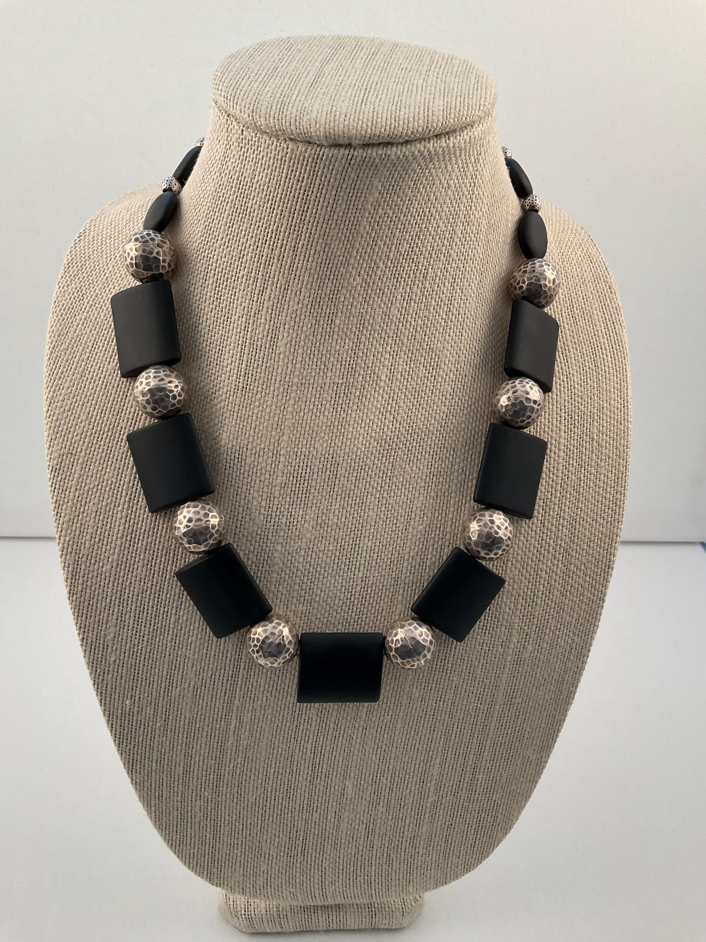 Matte Onyx trapazoid shapes accented with hammered silver beads