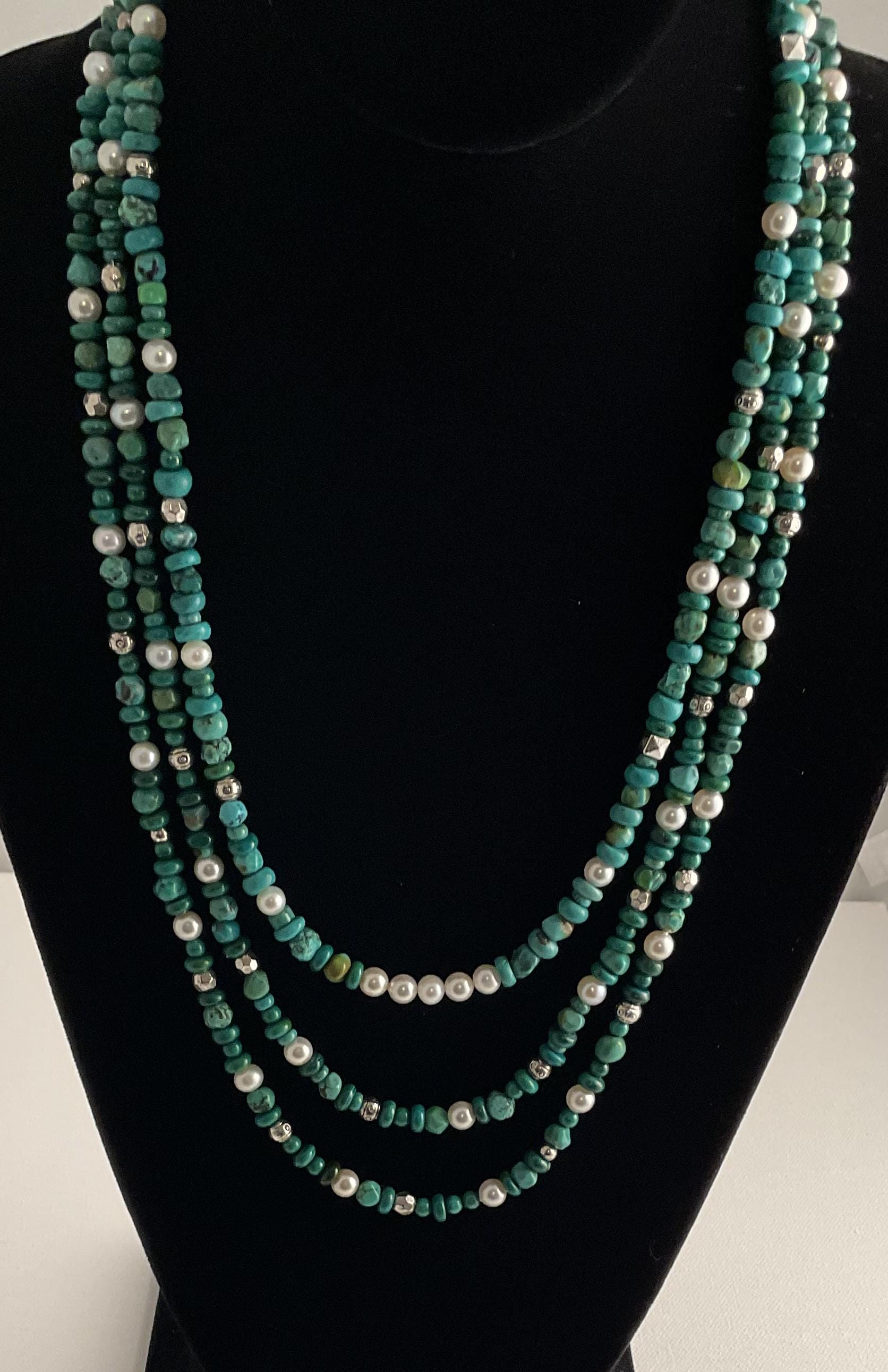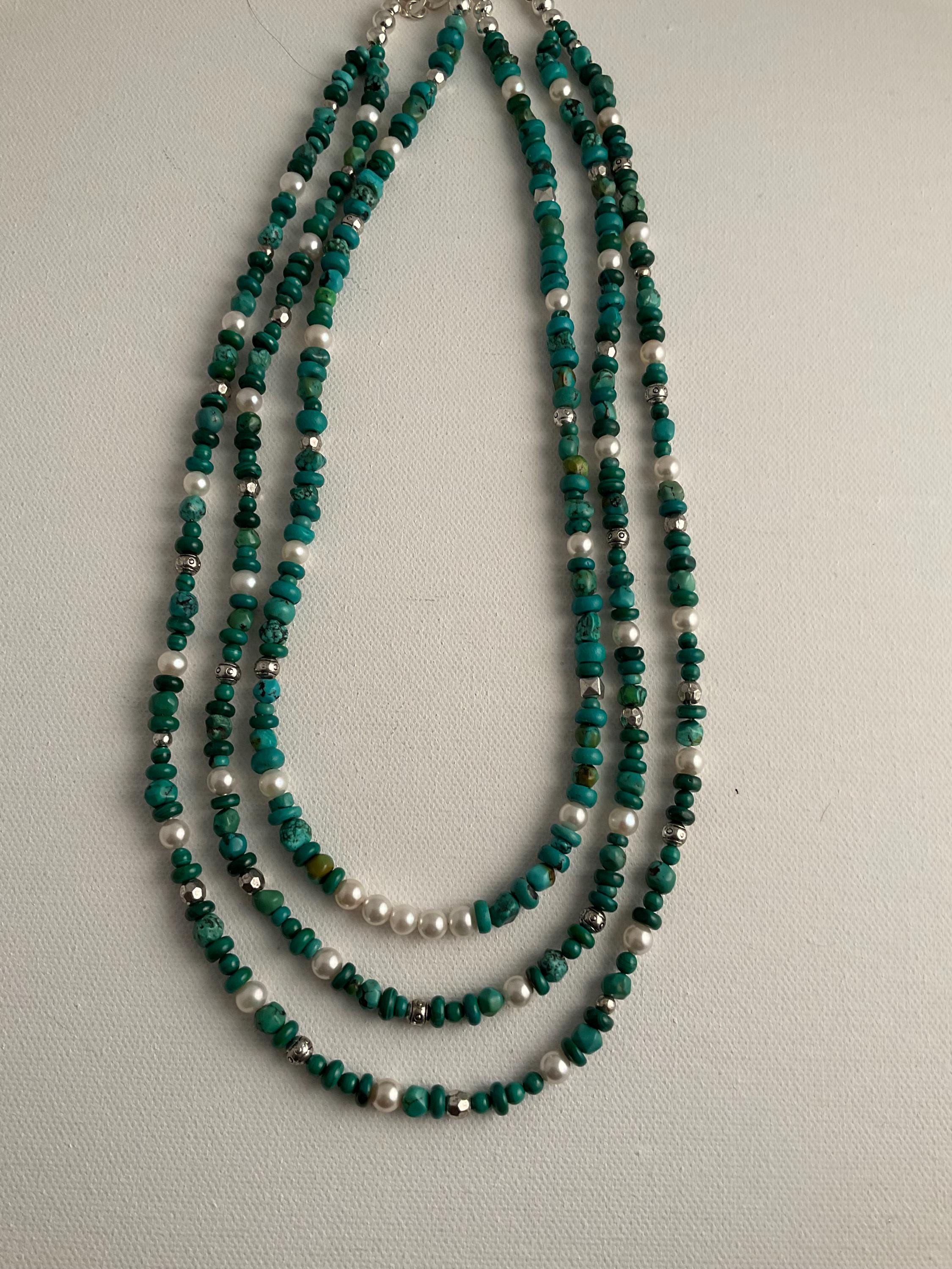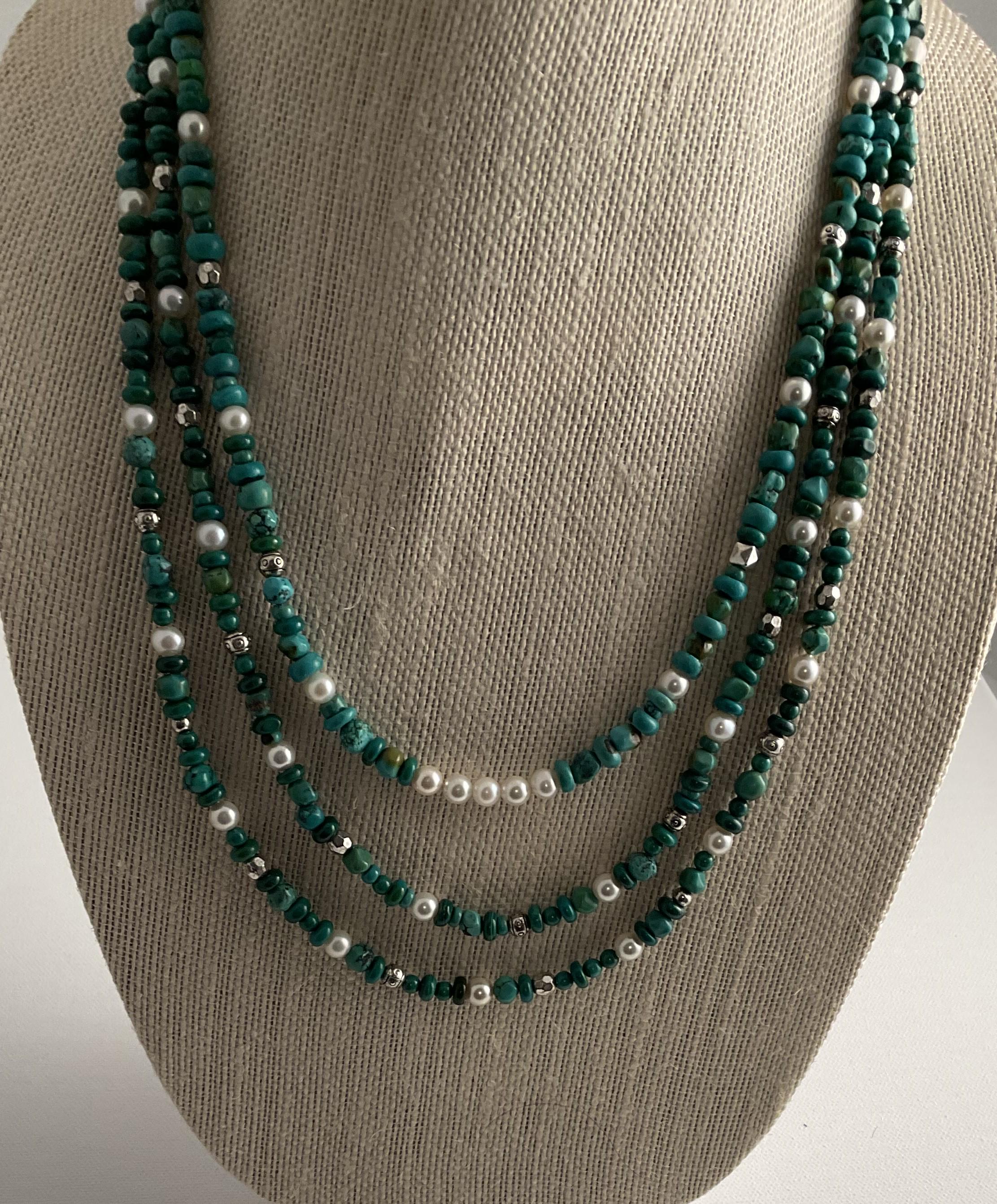 Lovely necklace with a combination of malachite, various turquoise shapes, pearls and various pewter findings. Designed as a three strand necklace. Two longer strands are connected and the center strand is separate and can stand on its own for individual statement. Each necklace has an adjustment chain. The longer two strand at the last chain option is 27" and the shorter strand is 23" at it's optimal length. The adjustable chain is approximately 2 ".