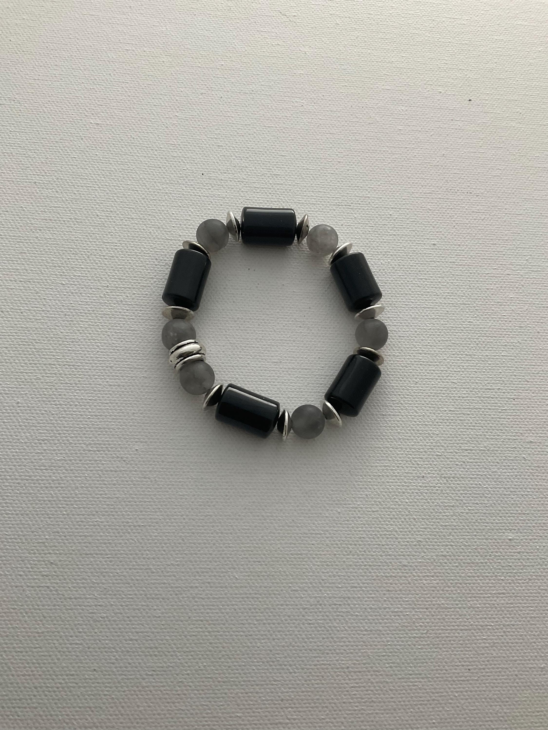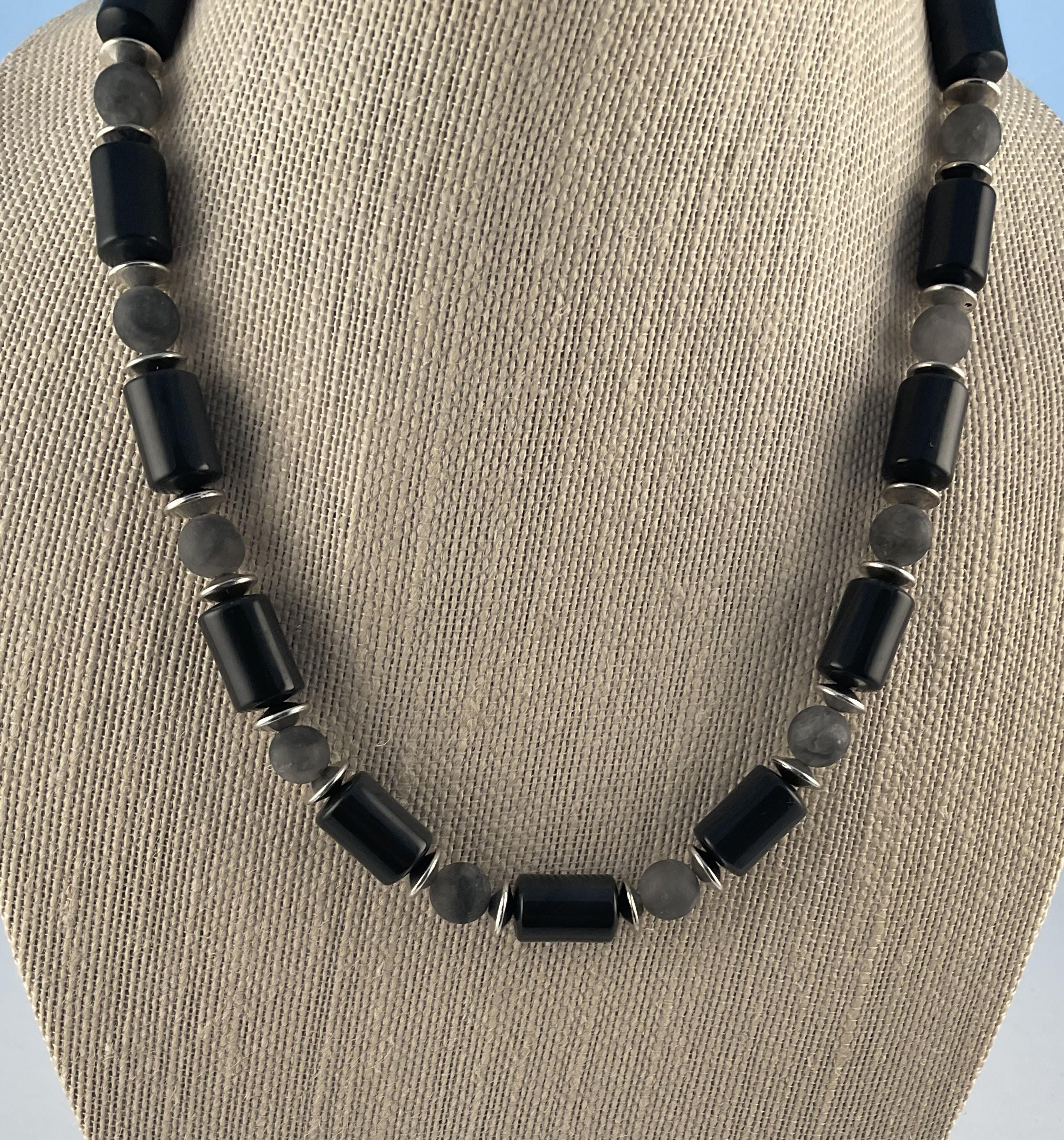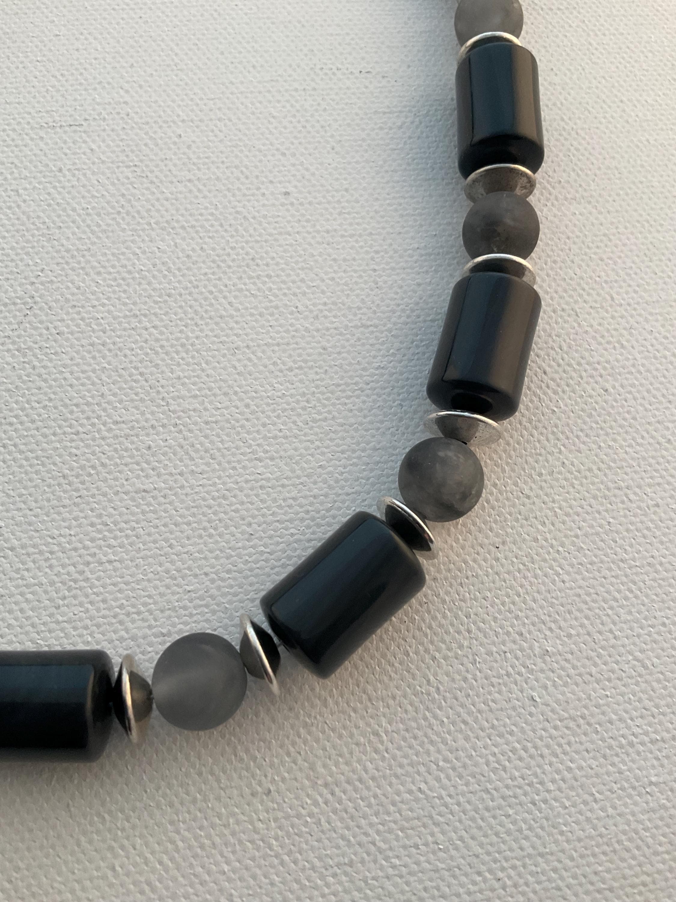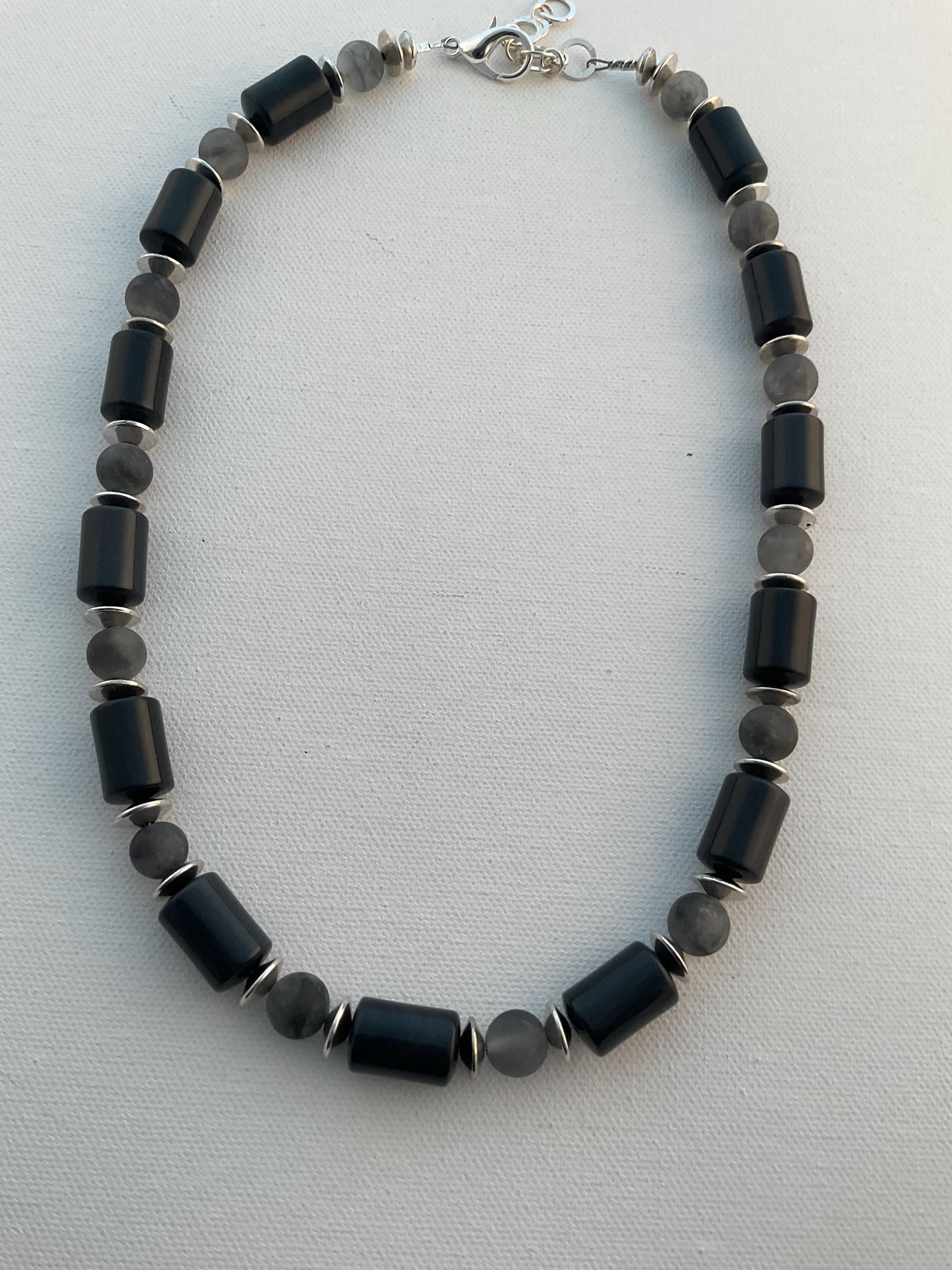 This necklace is a subtle mixture of shiny and matte gemstones producing a gentle flow of black and grey tones. The necklace is made of shiny obsidian barrel shaped beads and tourmaline quartz matte gemstones. A bracelet is also available for additional charge. The length of this necklace can be customized to fit any neck size. If interested please message me.