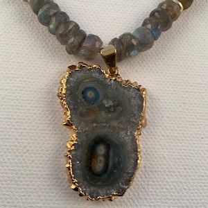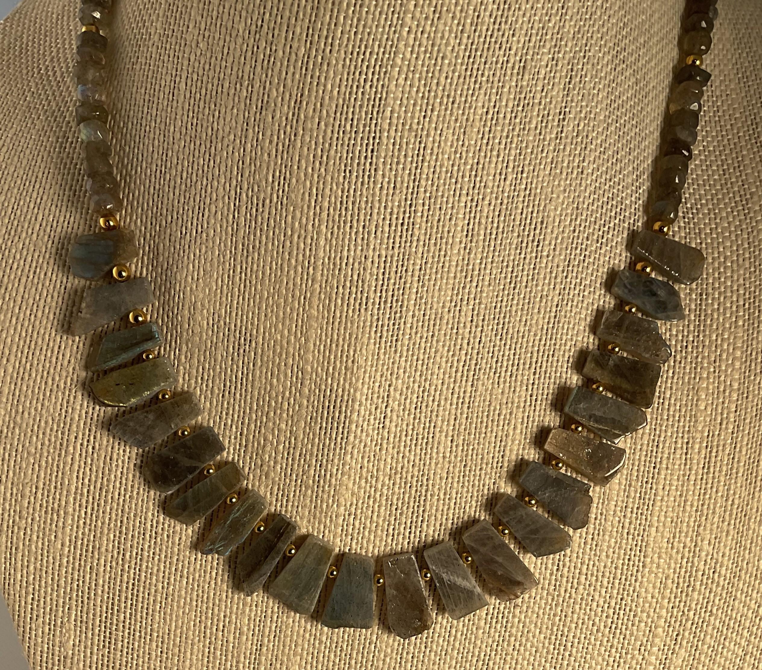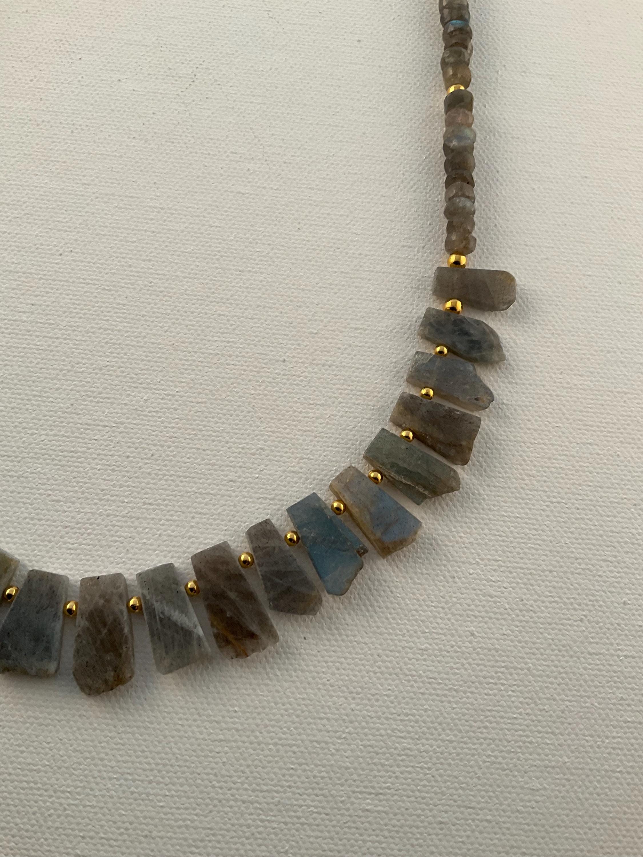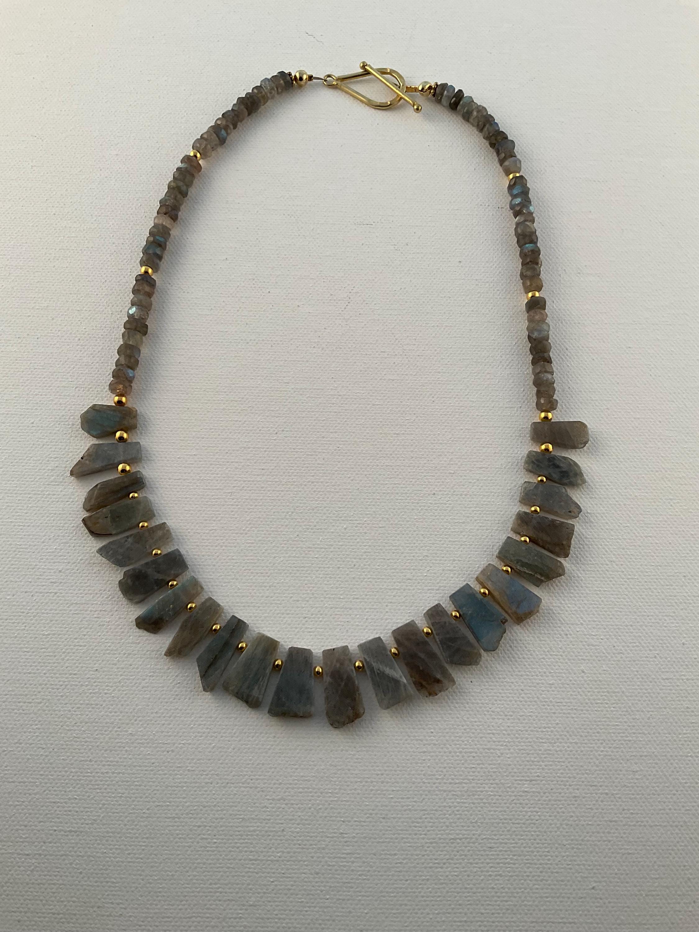 This stunning necklace glistens in the light and can be worn with a variety of colors. The labradorite slabs are an unusually rare cut. The necklace is finished with labradorite rondelle-shaped beads and a gold-filled clasp. The necklace measures 21 1/2 inches. If the buyer is interested in a shorter length please message me.