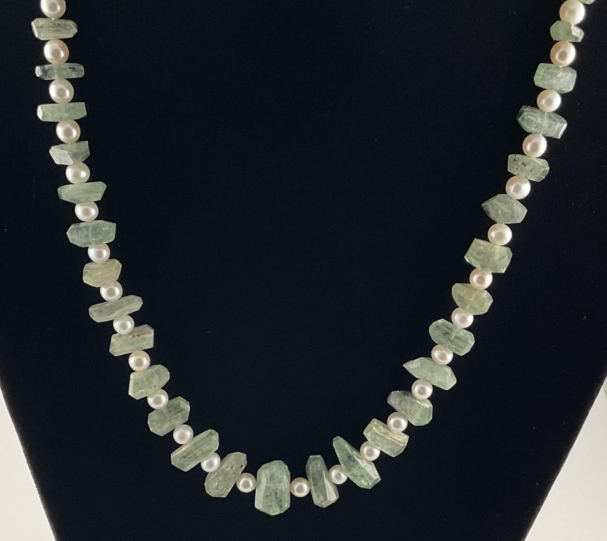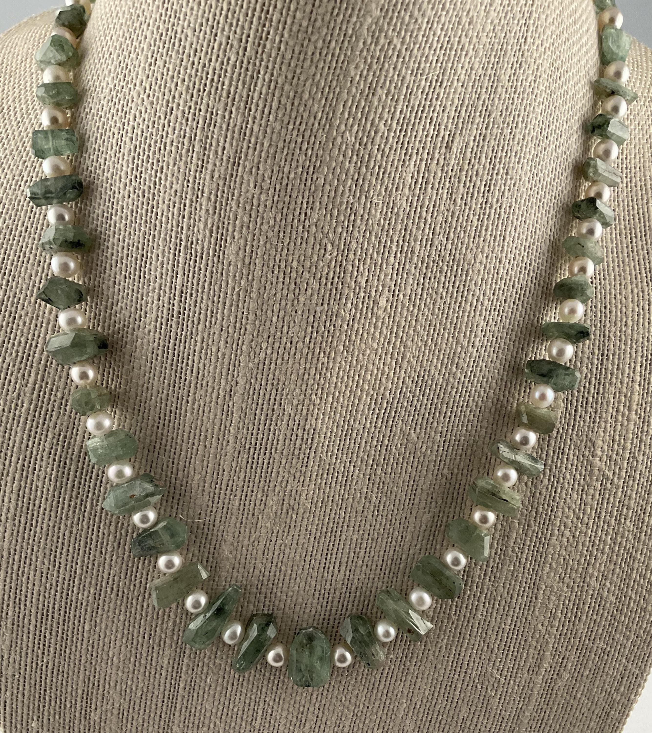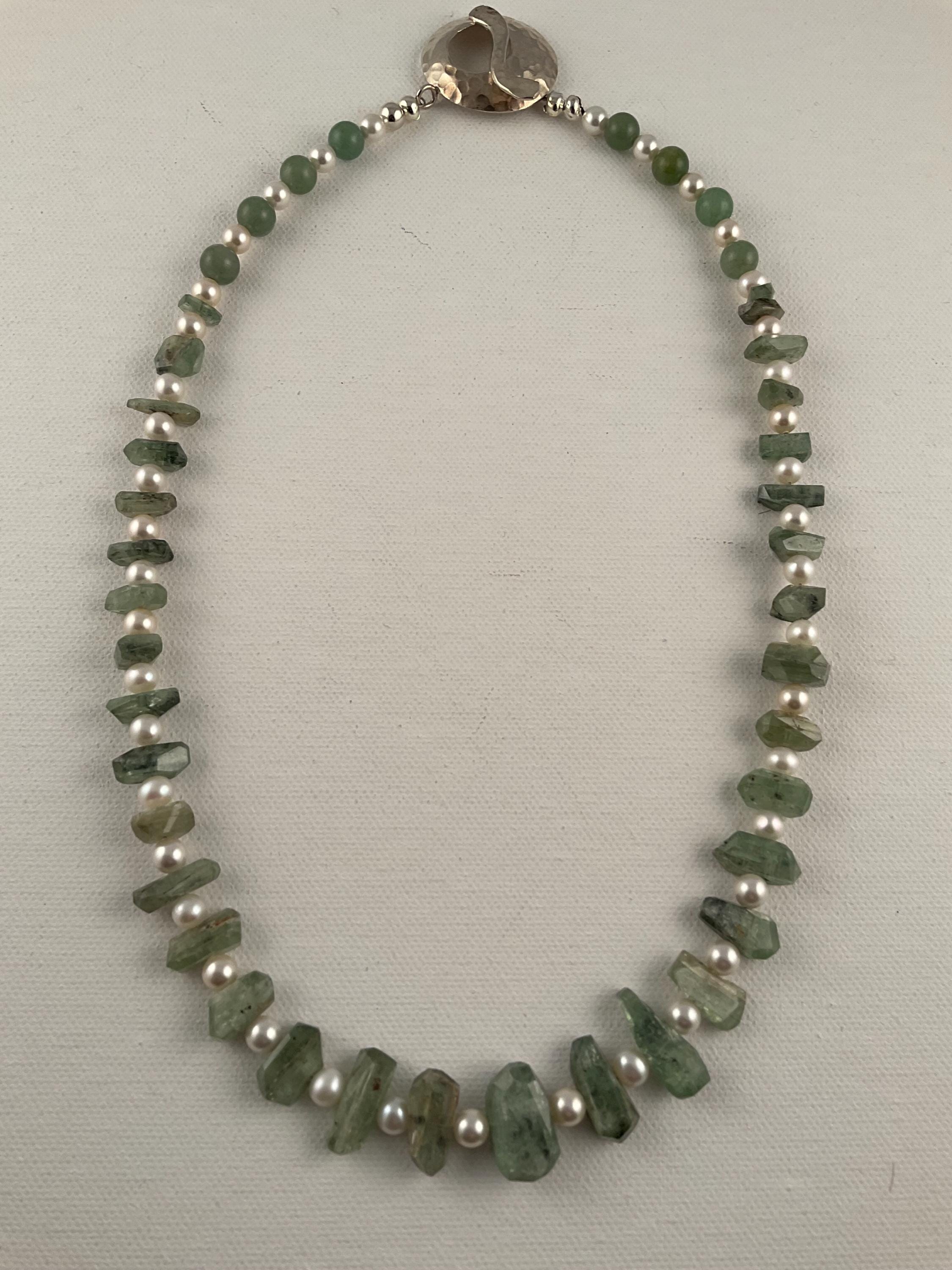 This is a stunning necklace and clearly understated in appearance. The Kyanite small stick-shaped beads are accented by pearls and finished with amazonite beads and a sterling silver clasp. Thby is necklace measures 21 1/2 inches and can be made shorter or longer if desired. Please message me your desired length.