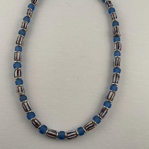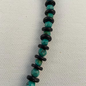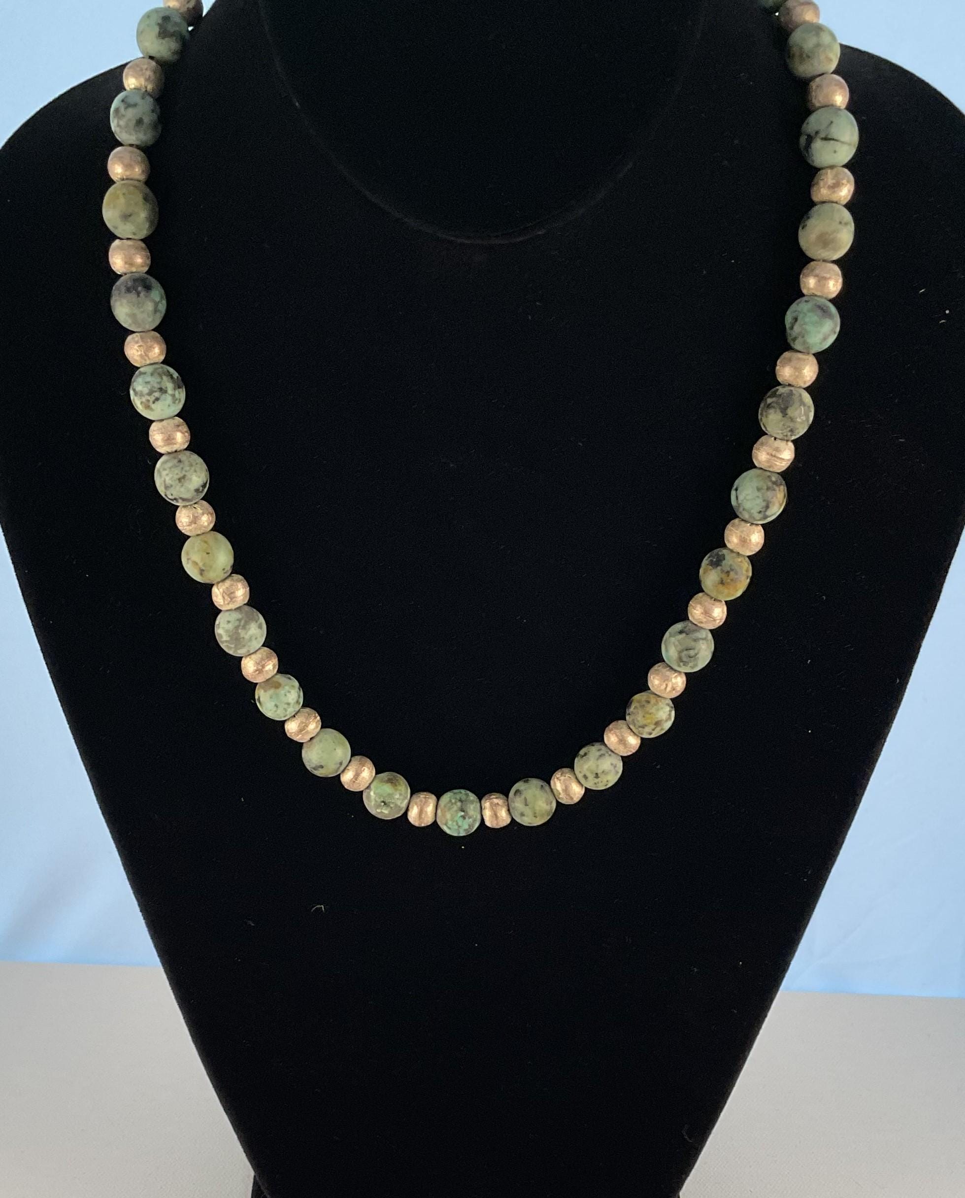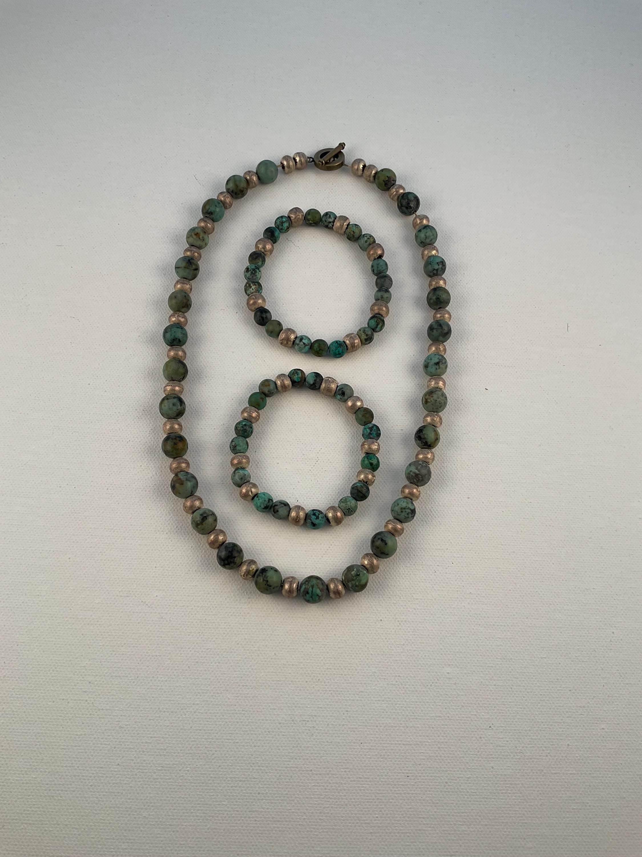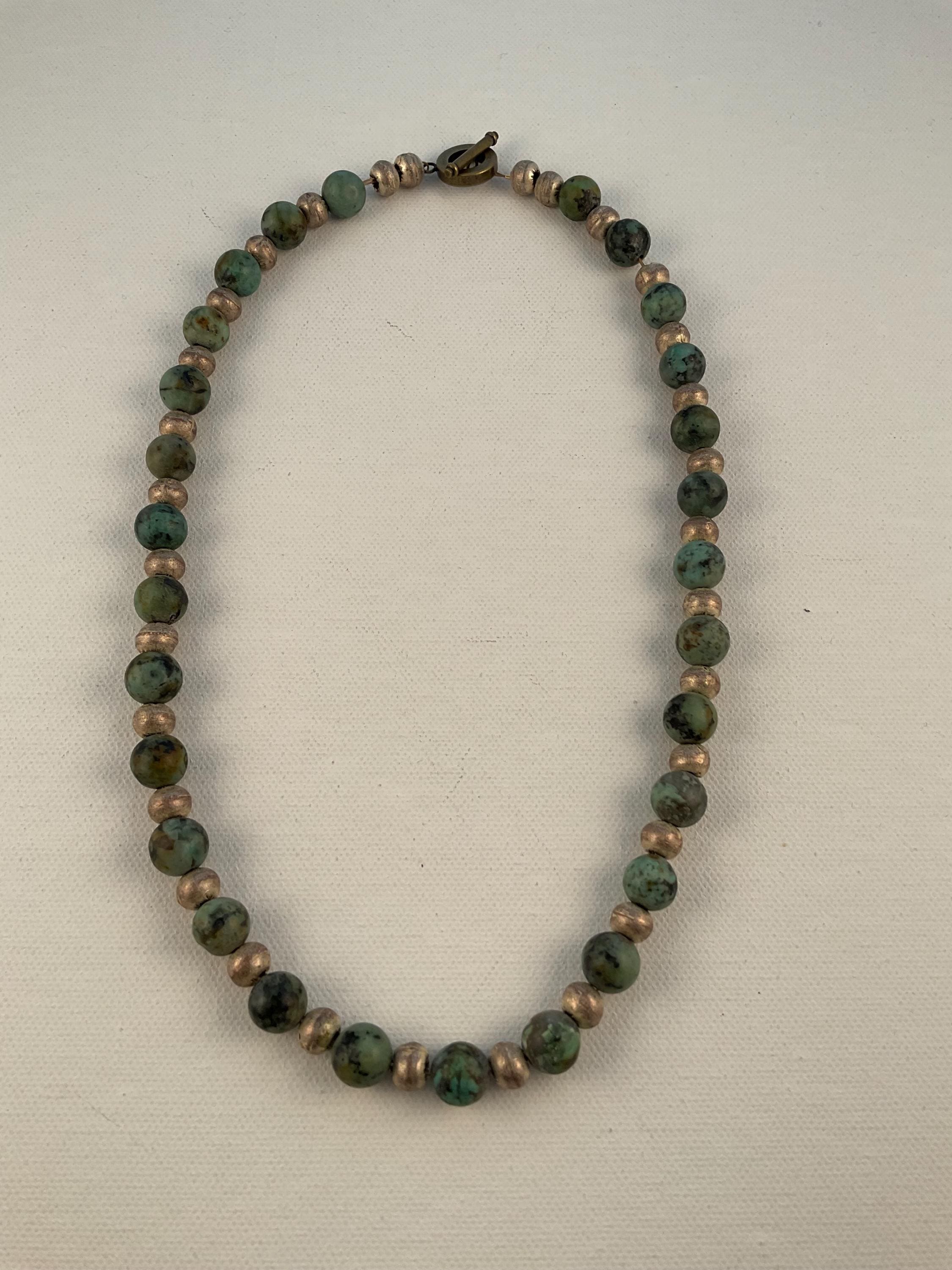 The matte finish on the African Turquoise blends beautifully with the florentine finish on the brass beads. The necklace has an overall mystical aura around it. It give a very subtle impression. This necklace can be made to order in a length desired--just message me. There are also bracelets on elastic cord that are available. The necklace shown is 21" and has a brass toggle clasp.