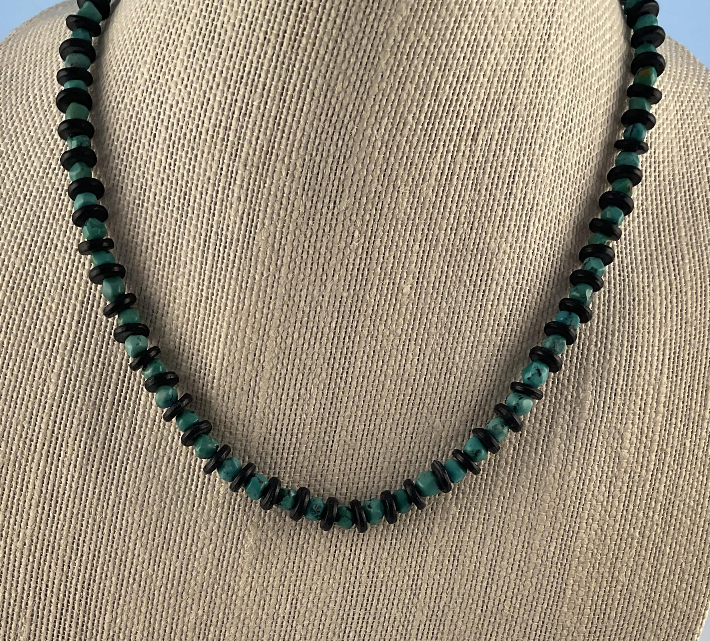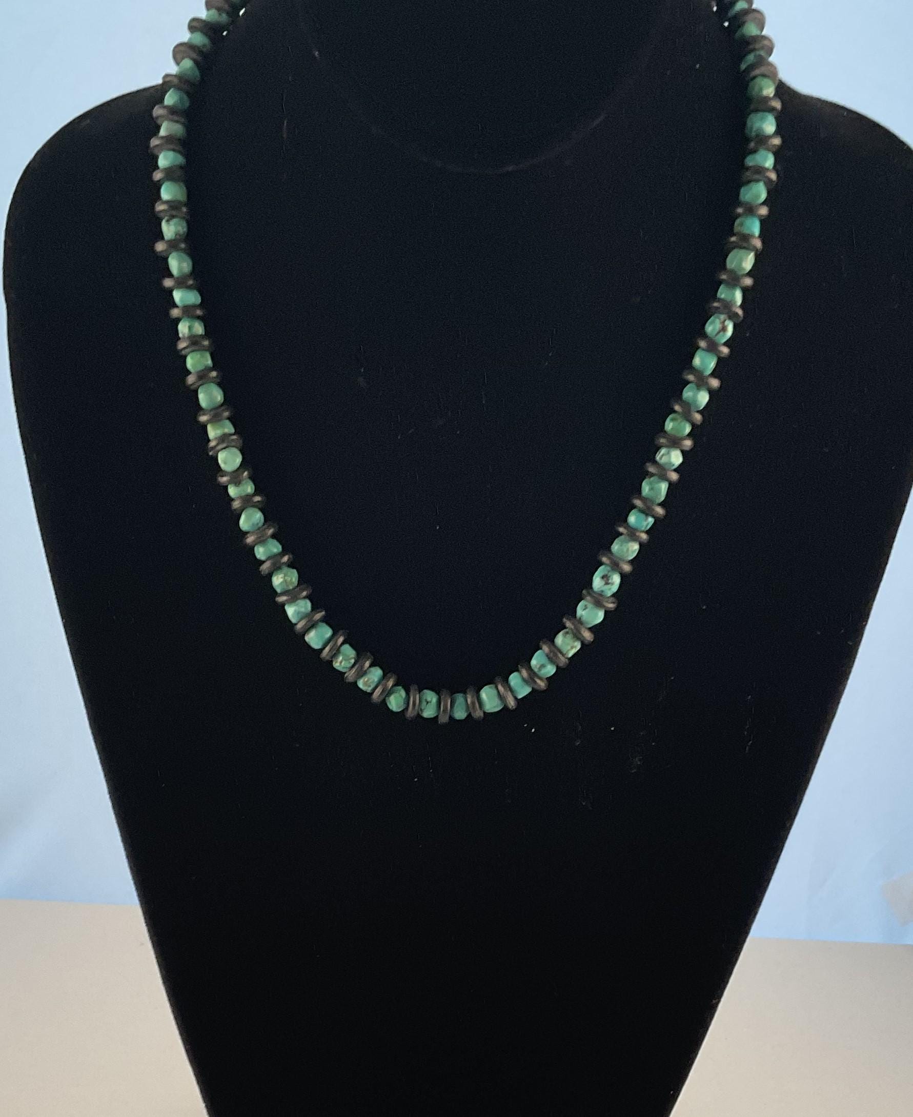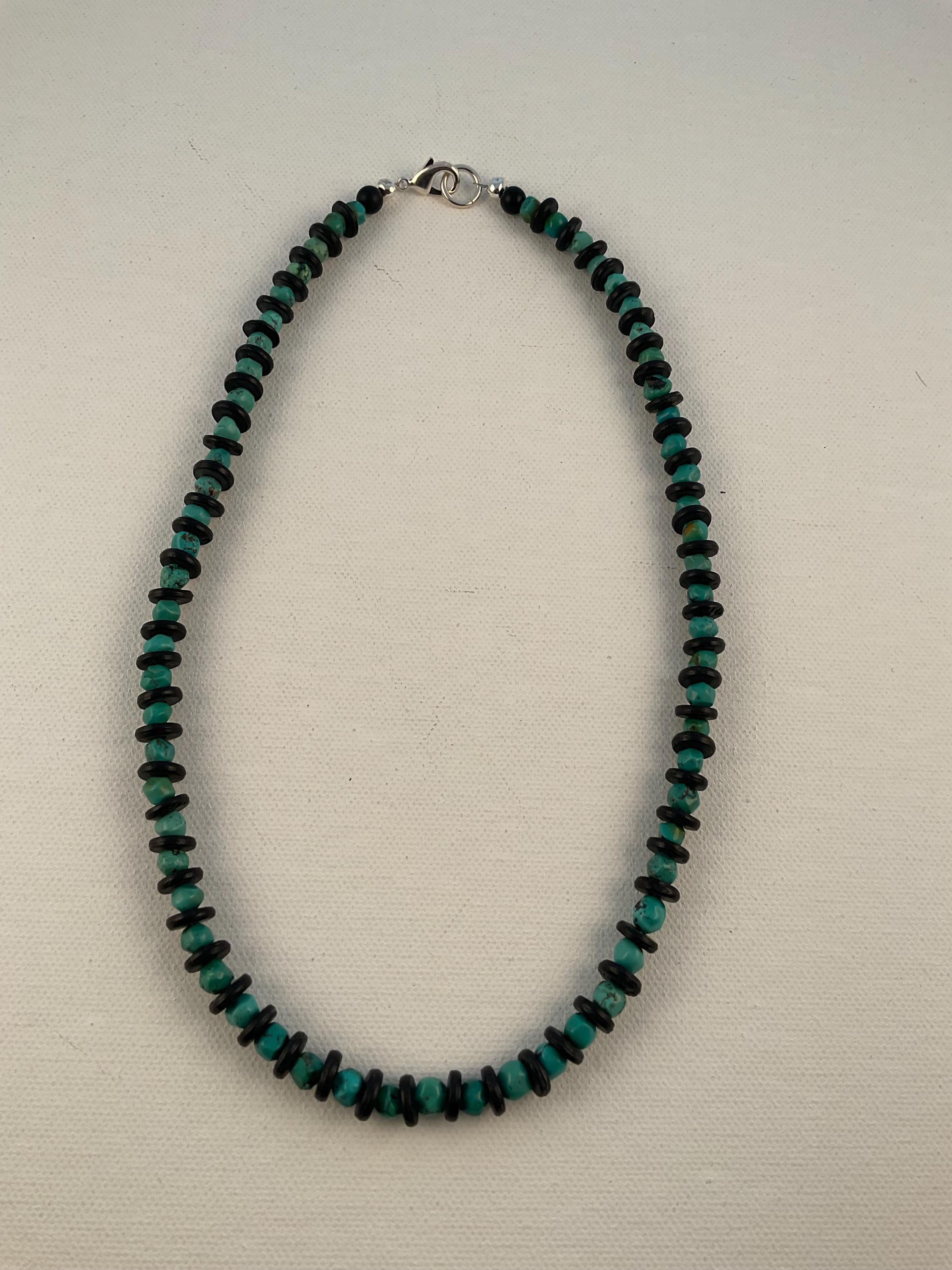 Simple and Subtle Statement for any occasion. The turquoise nuggets all different shapes providing an underlying texture to the necklace. The black wood spacers highlight each nugget! This necklace can be shortened or lengthened if requested. The necklace shown measures 19" inches.
