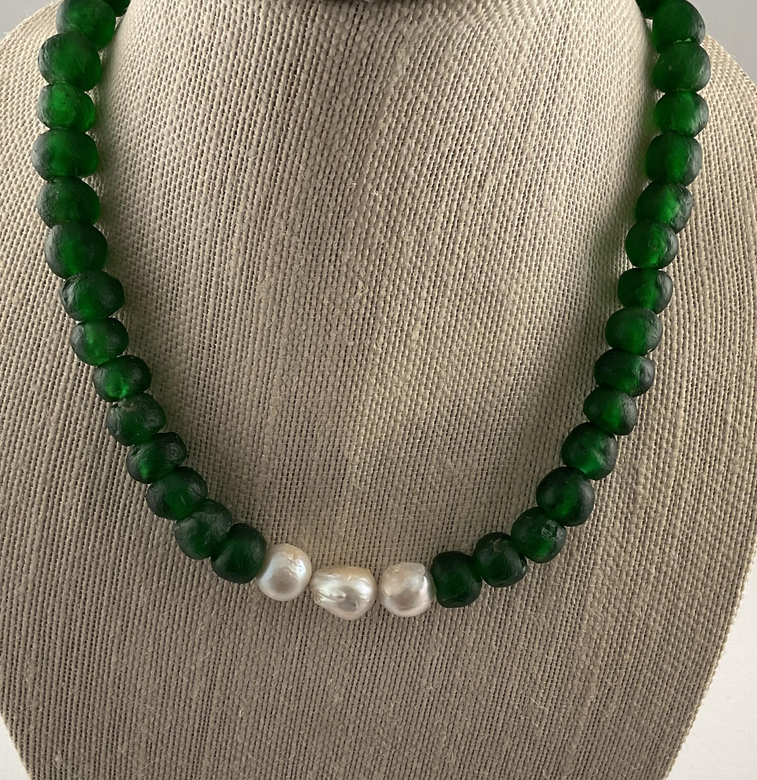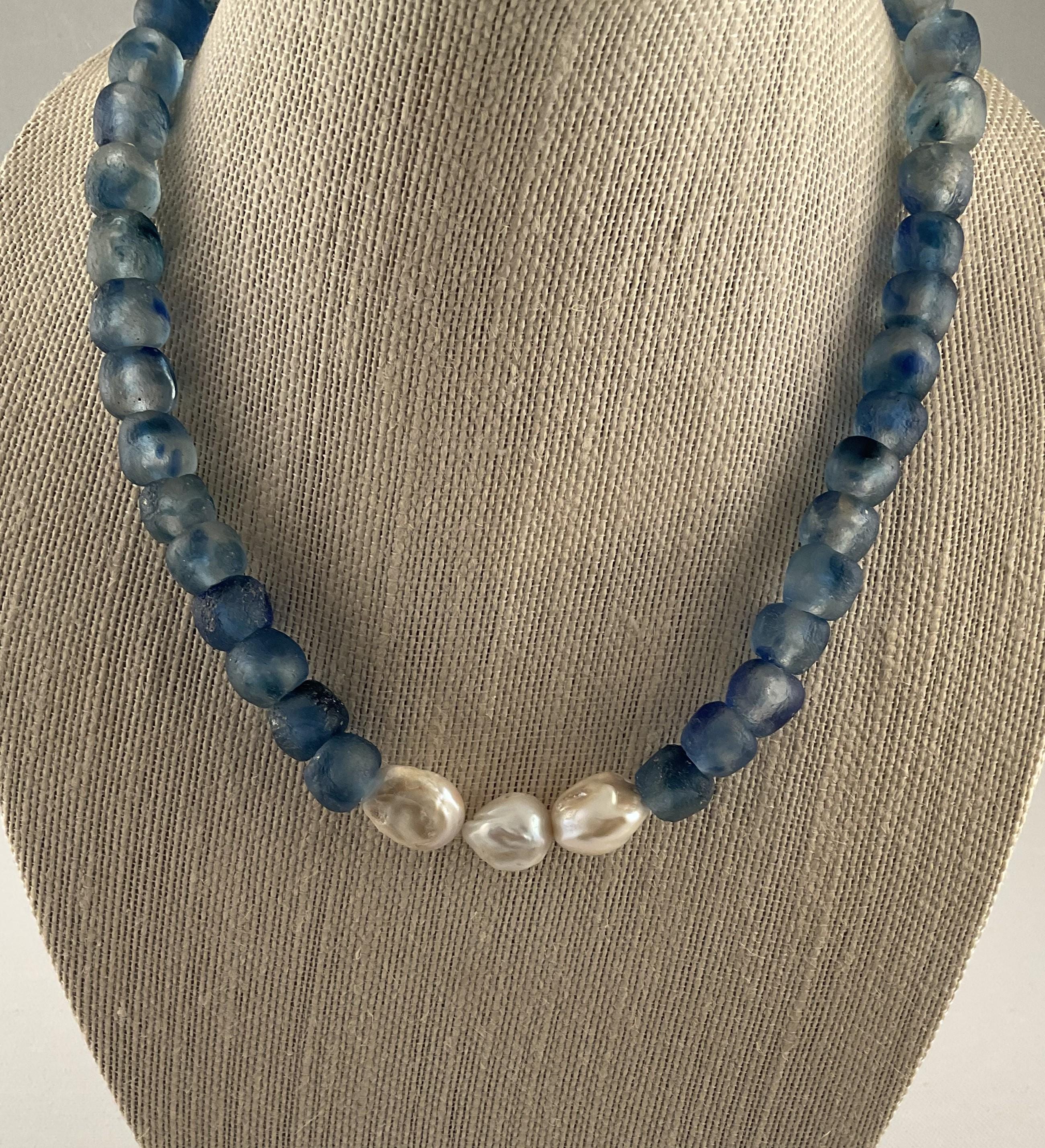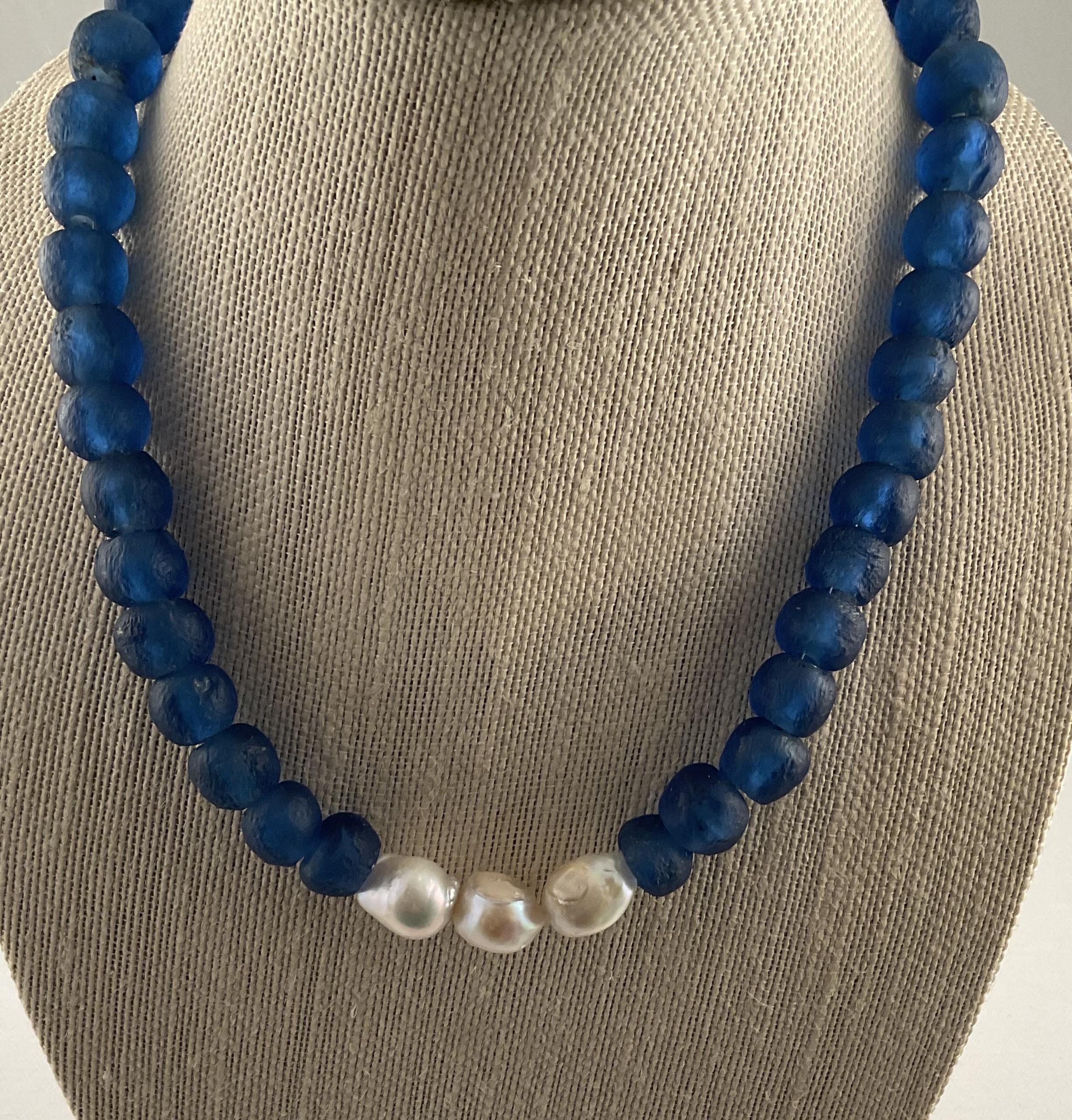 The African Glass Beads make a statement by themselves and accenting with the Baroque pearls completes the total impact of the necklace!. This design is available in dark green and a lighter shade of blue as shown in the pictures. They all measure 20 1/2 inches with a one inch extension. The necklaces can be shortened upon request. Message me the color selection.