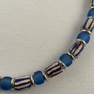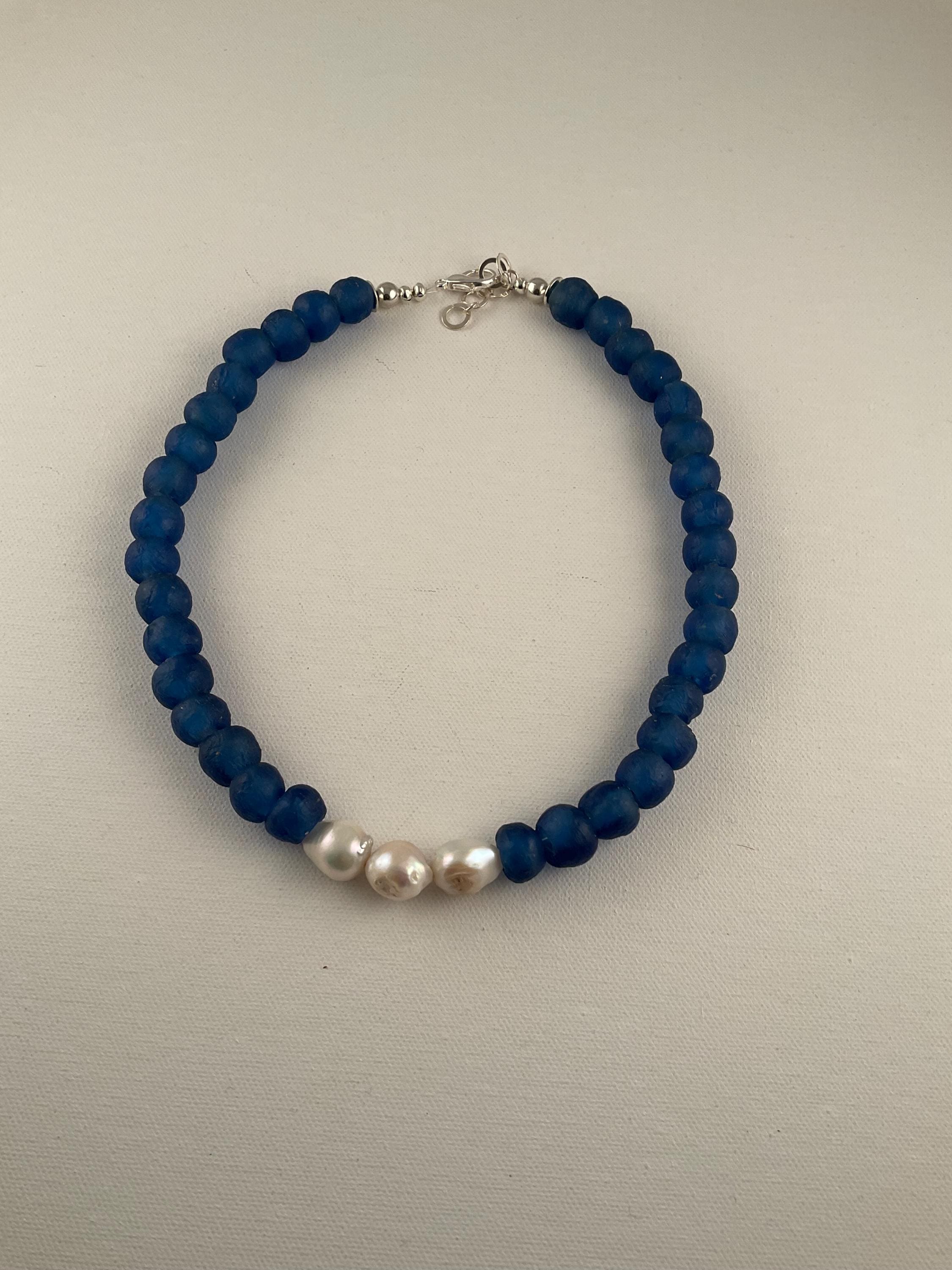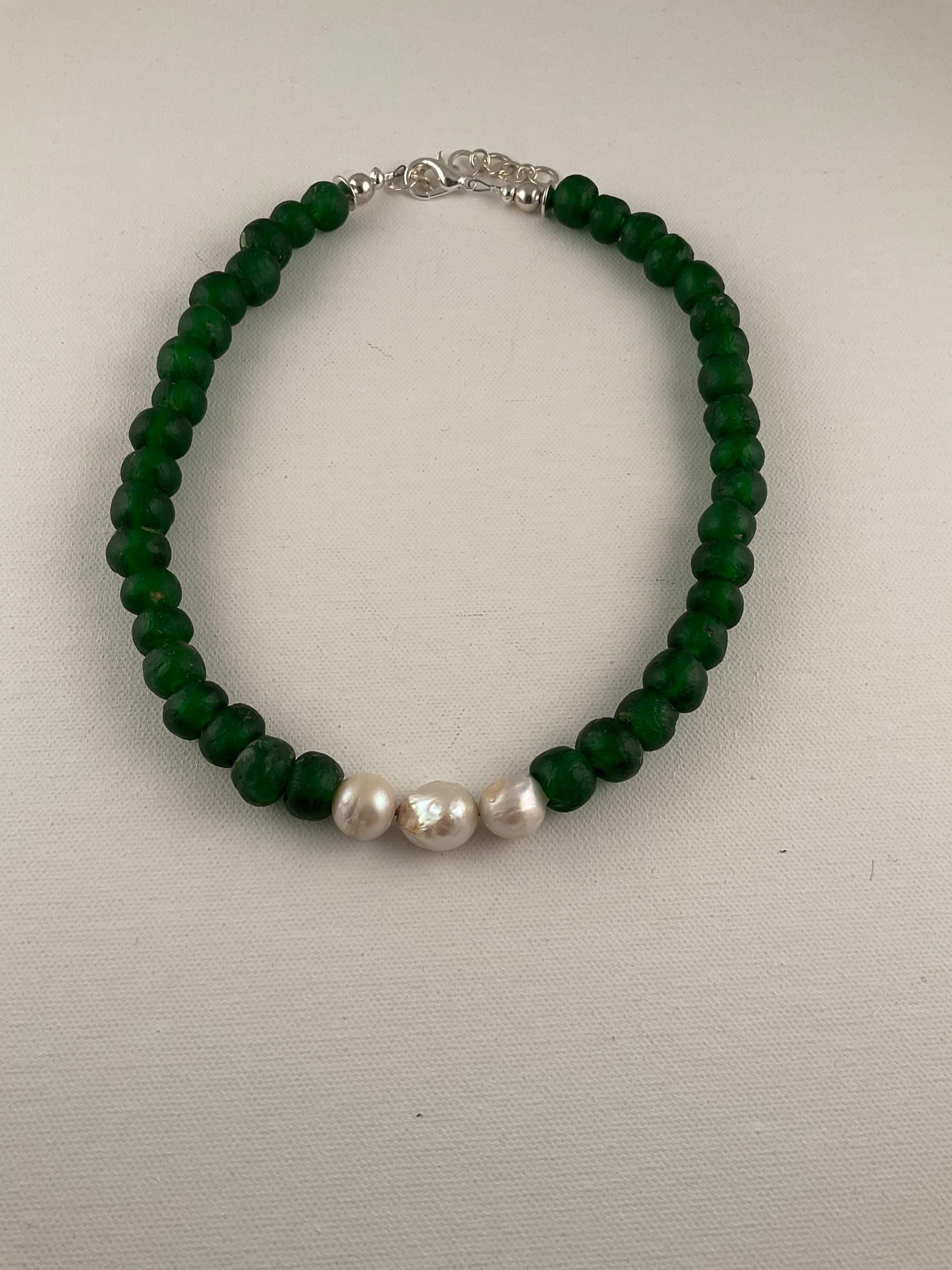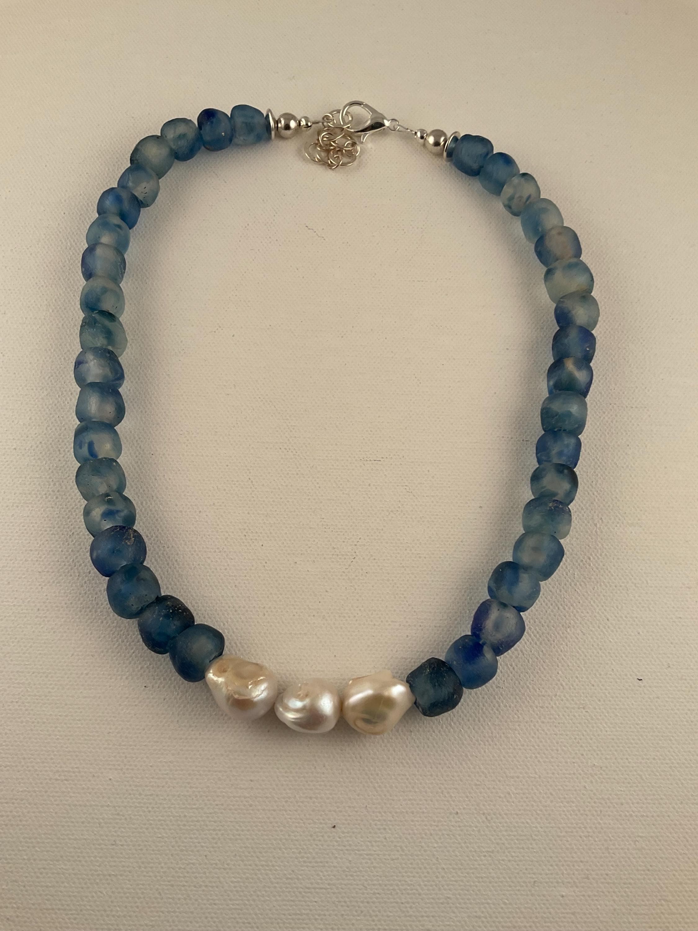 The African Glass Beads make a statement by themselves and accenting with the Baroque pearls completes the total impact of the necklace!. This design is available in dark green and a lighter shade of blue as shown in the pictures. They all measure 20 1/2 inches with a one inch extension. The necklaces can be shortened upon request. Message me the color selection.