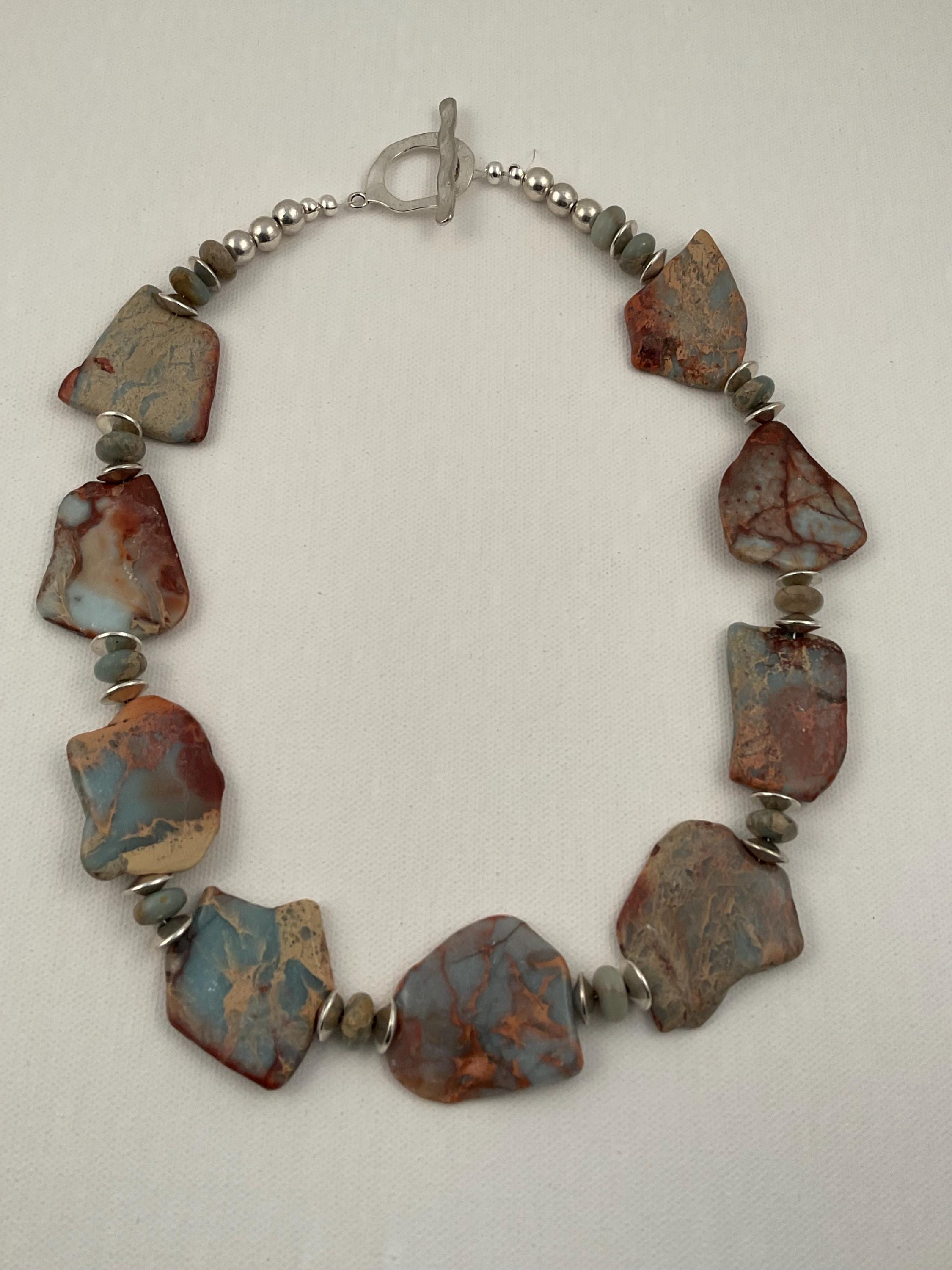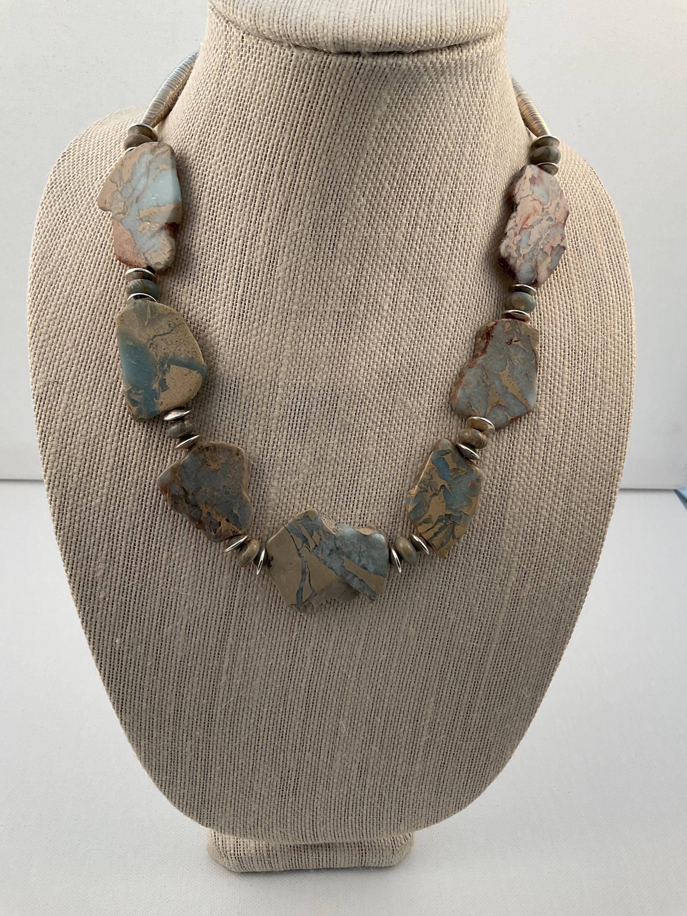 This unique necklace consists of Agua Terra Jasper slab-shapes reflecting blended tones of turquoise, cinnamon and taupe. The slabs are separated by pewter spacers and aqua terra jasper rondelle beads. It is finished with a pewter clasp. It measures 21 3/4 inches. A definite accent for any time of day!