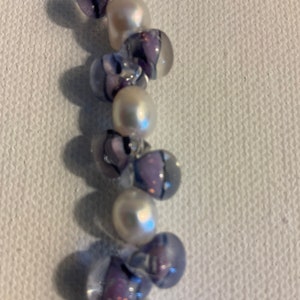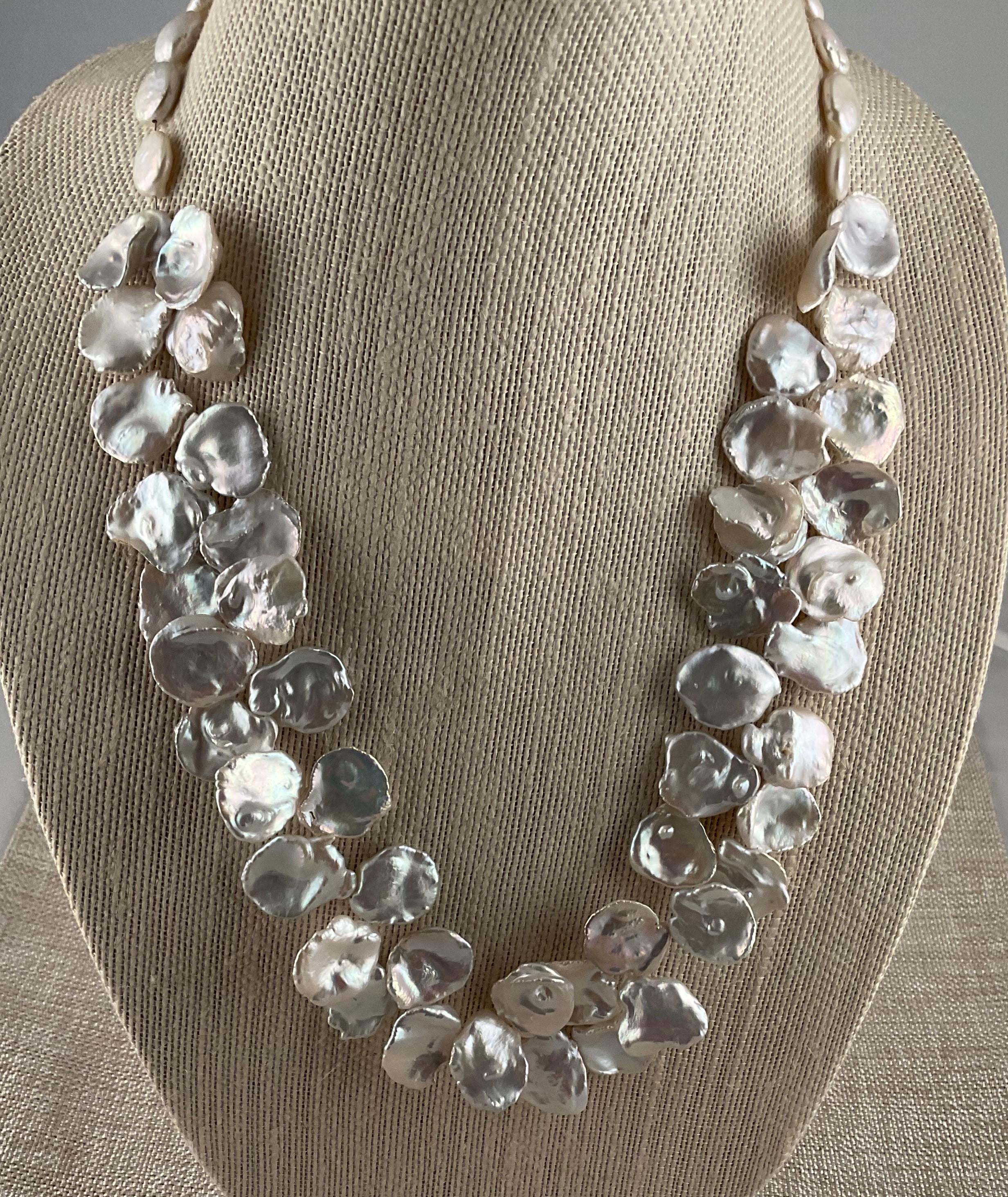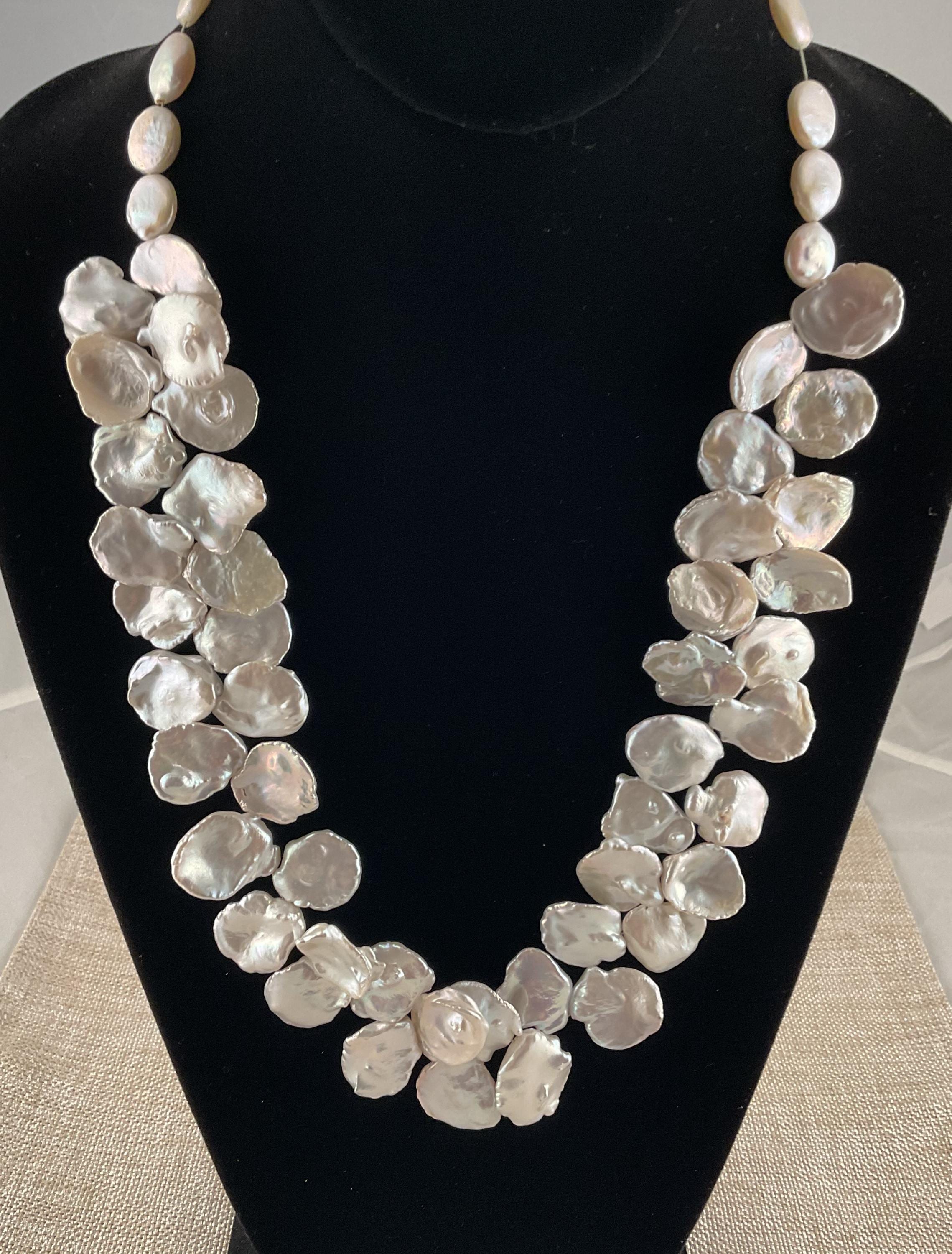 These exquisite heishe pearls literally light up this necklace! It measures 24 1/2 inches. I left it long for more impact but it could be shortened by request. The necklace is finished with coin pearls which will lay nicely on the back of the neck, and a silver toggle clasp. I