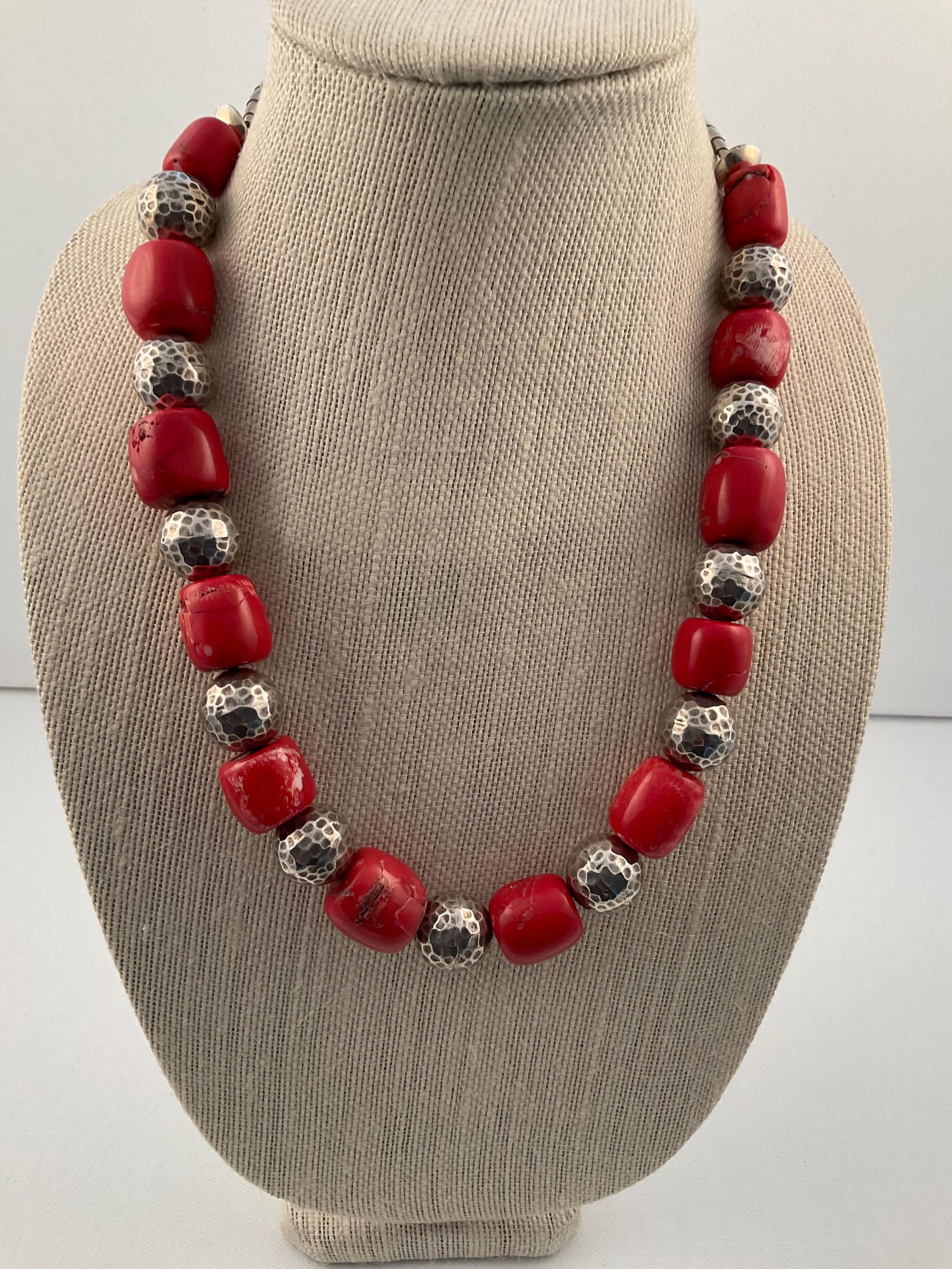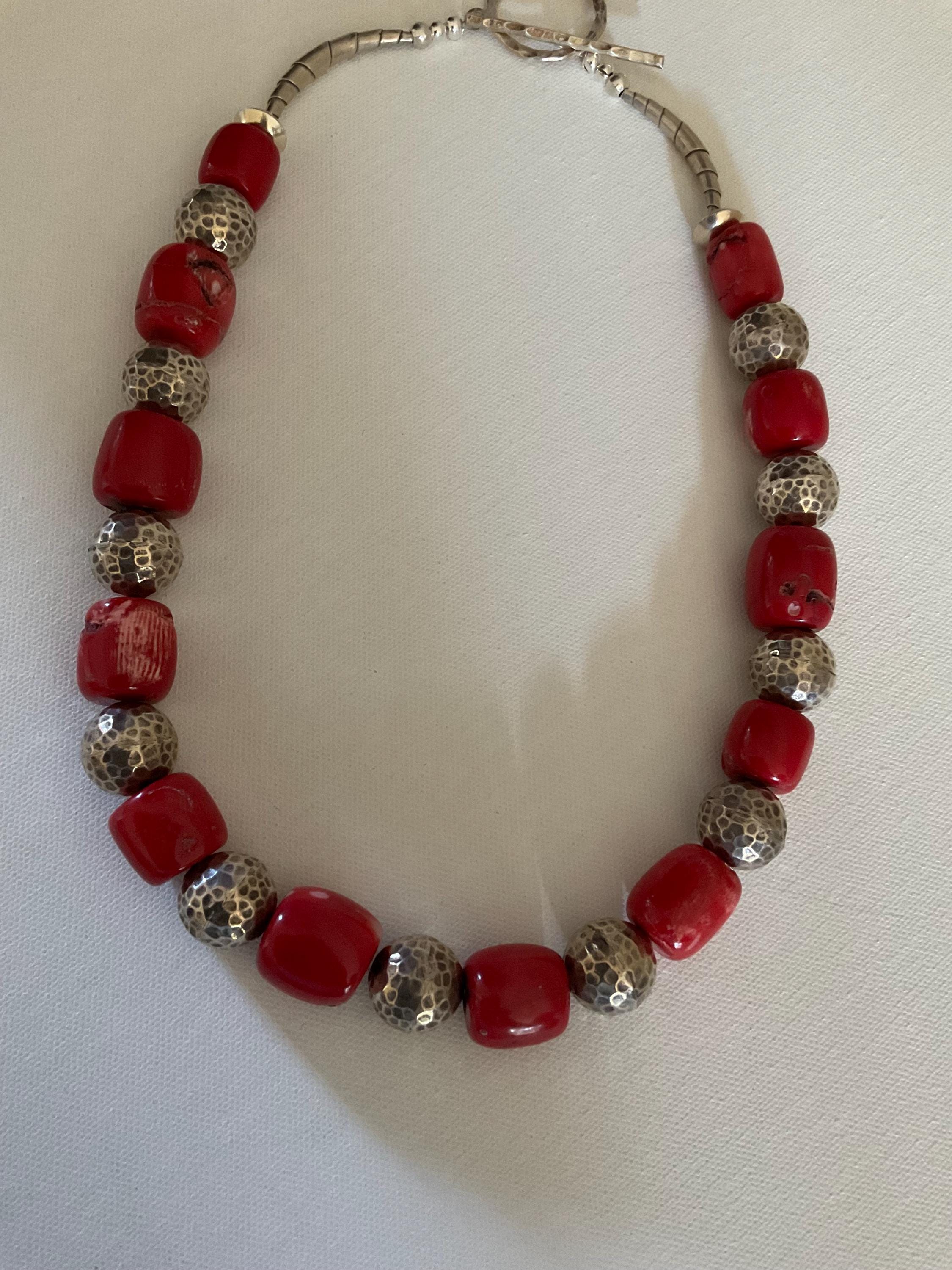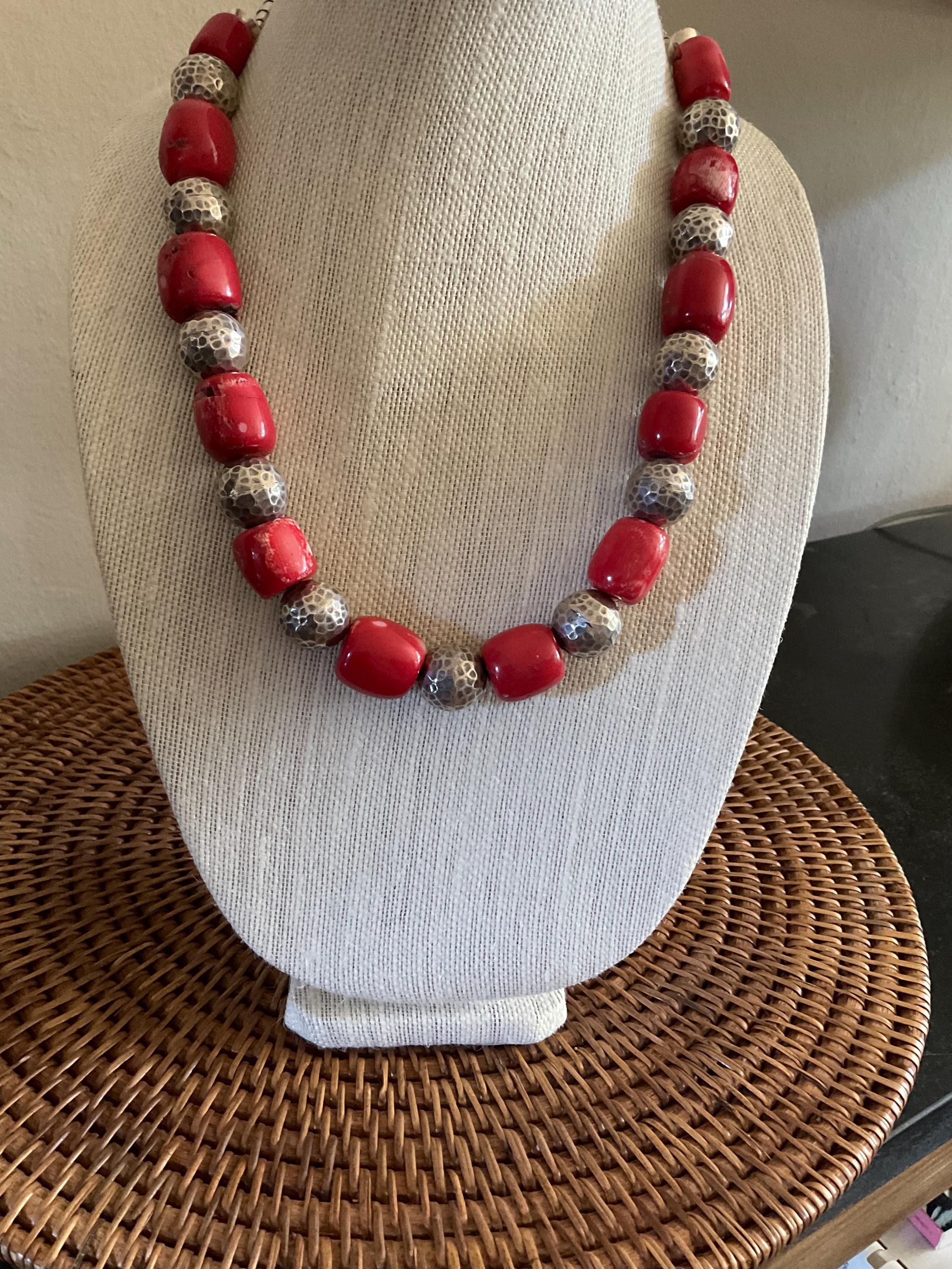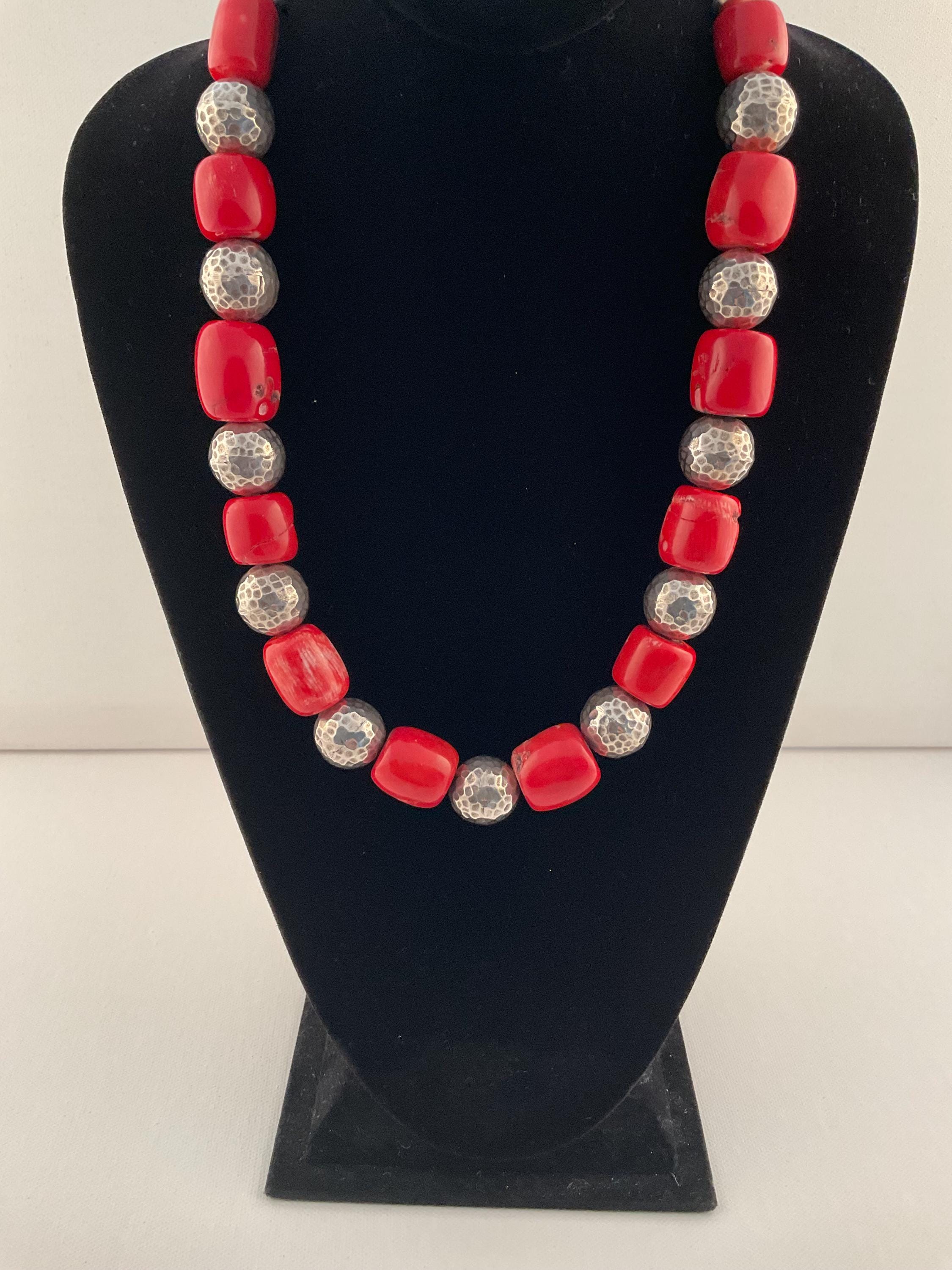 These antique coral beads and paired with hammered silver beads to blend for an overall antique look. It is a bold necklace but the antique coral beads are the beauty of the necklace! The necklace is finished with silver beads to match the curve of the neck and is finished with a silver toggle clasp.