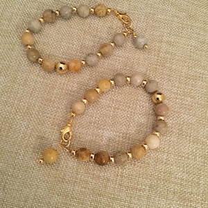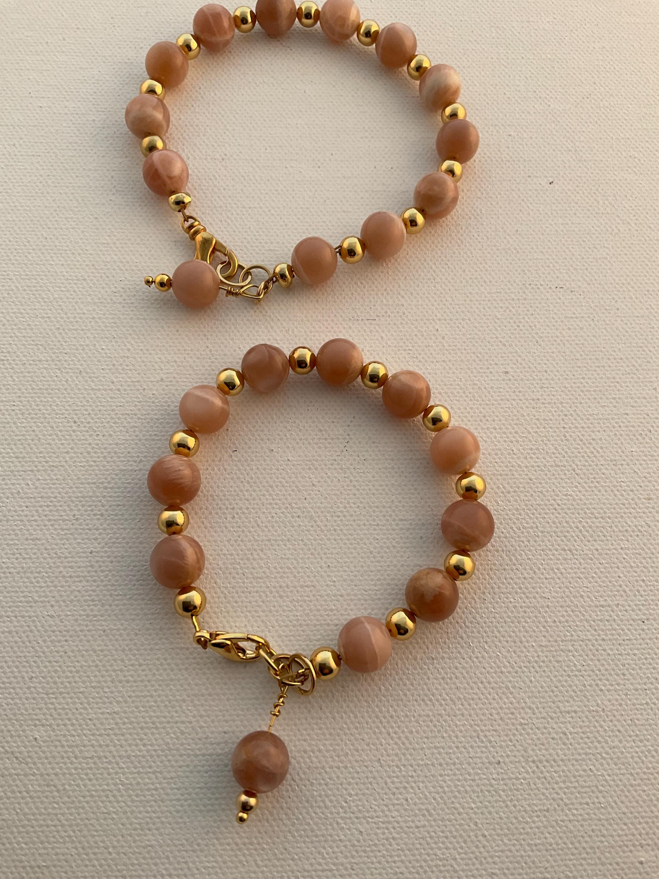 Lovely iridescent moonstone beads with gold filled accents. There are two bracelets, one 7 1/2 inches and the other is 8 1/2 inches. If you know the length required, they can be shortened or lengthen as needed. Please message me the requirements. The bracelets are closed with a lobster claw clasp.