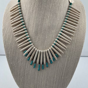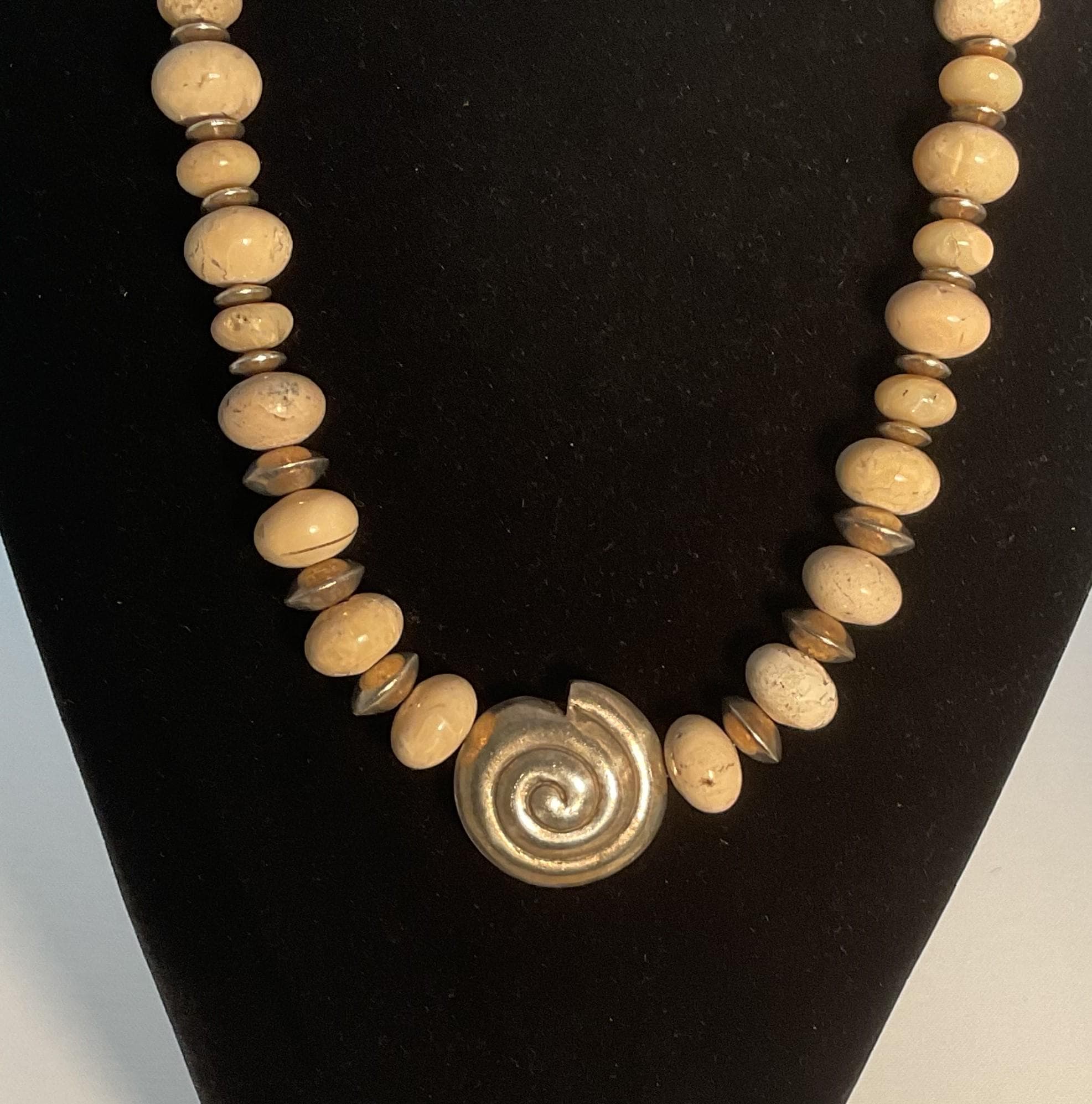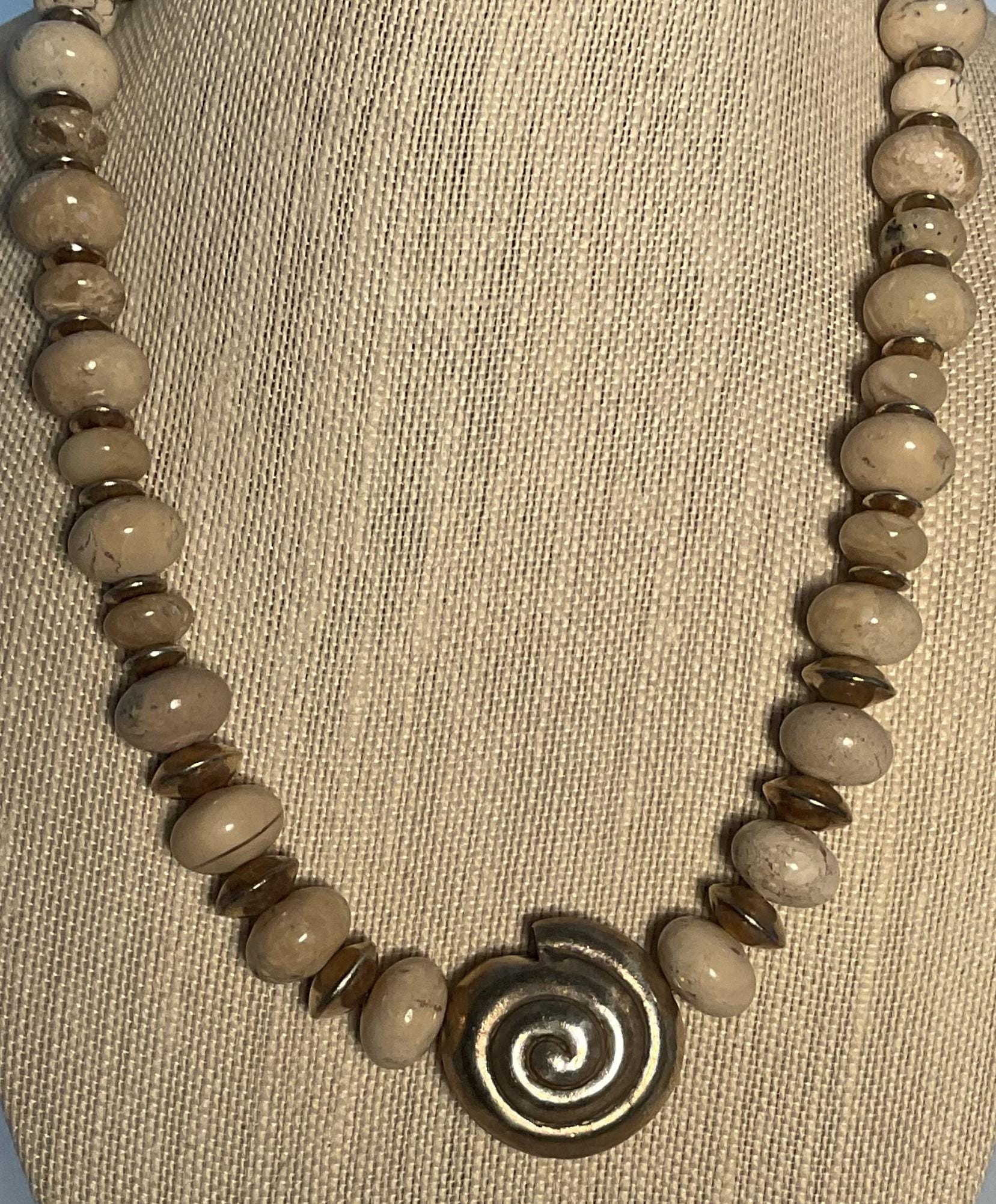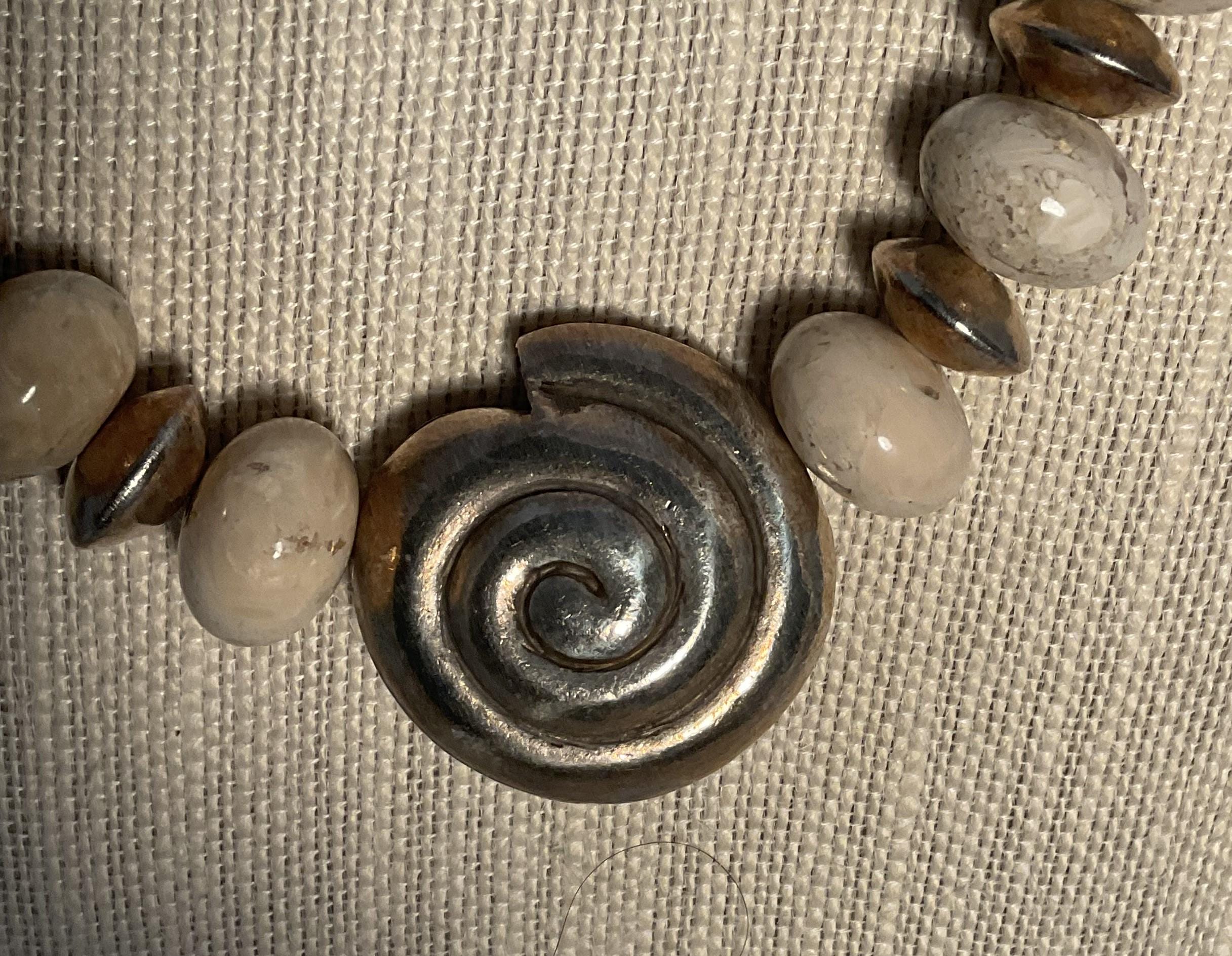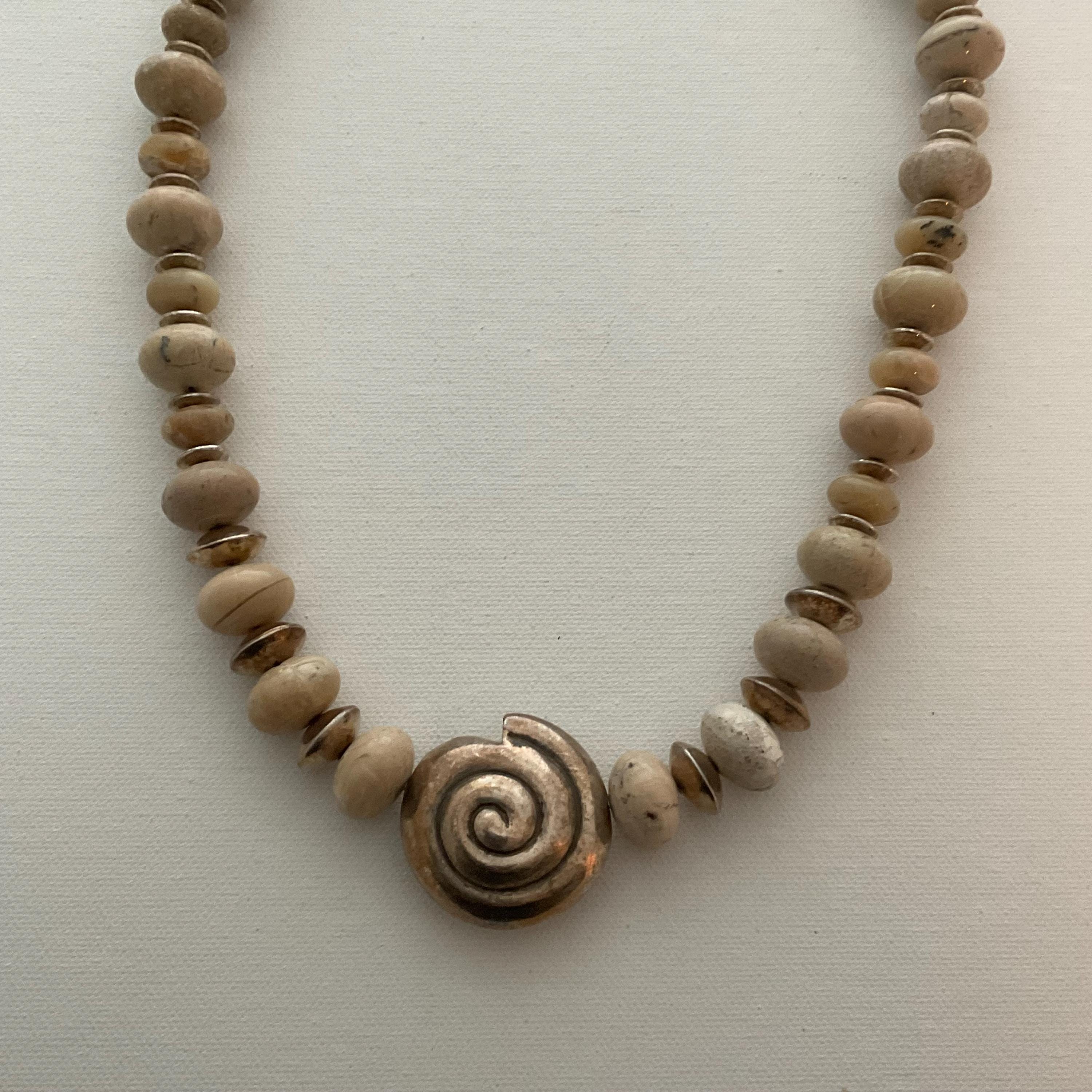 The dendritic jasper is accented in this necklace with sterling silver. The focal bead is from Hands of the HIlls and is also silver. The necklace measures 23 inches and is finished with a Kim Fox handcrafted clasp. The necklace can be shortened or lengthened upon request.