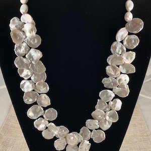 The is a double-strand, twisted pearl necklace. There are various sizes and types of pearls in this necklace and is accented by a sterling silver clasp. This necklace appears to be understated but it is, in fact, a dramatic neck piece which catches everyone's eye!