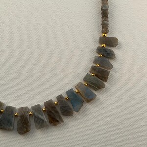 The matte red creek jasper coins are accented by diamond shaped matte black onyx shapes. There are two different necklaces shown in the pictures with different placement of the black onyx. The other components remain the same. The necklace is finished with a bronze Saki Silver clasp.
